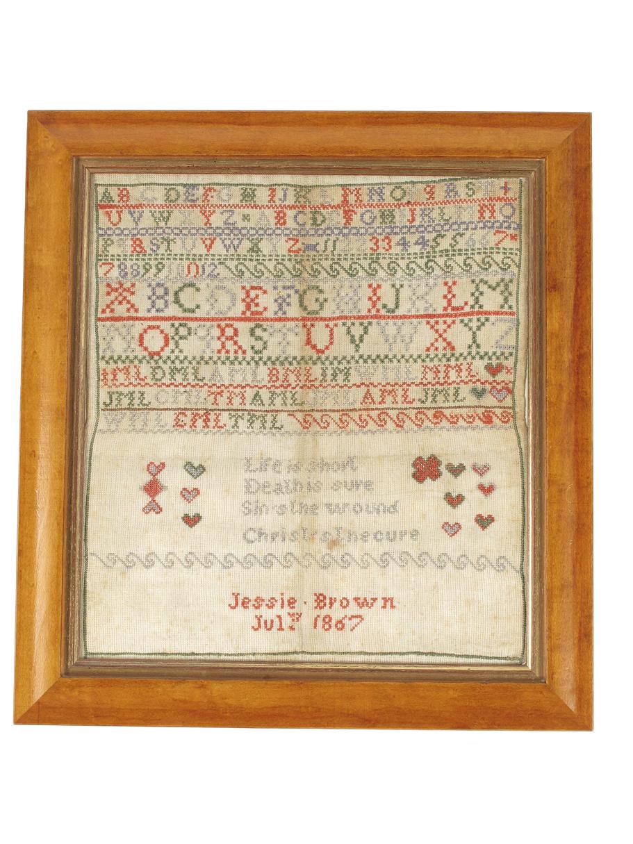 A Victorian needlework sampler, by Jessie Brown, July 1867, worked with alphabets, numbers, hearts and a verse 'Life is short, Death is sure, Sin's the wound, Christ's the cure', 13.25 x 12in (33.8 x 30.5cm), in a later glazed bird's eye maple frame.