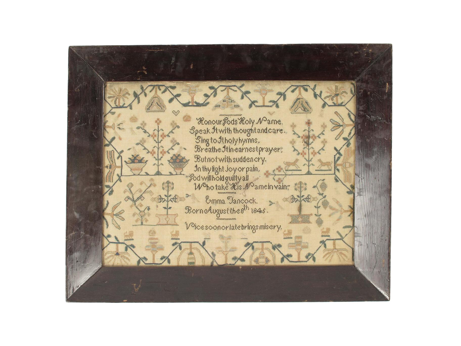 A Victorian needlework sampler, by Emma Jancock, Born August 8th 1845, worked with urns of flowers and animals, with verse and an outer band of scrolling flowers, 12.5 x 17.25in (31.7 x 43.8cm) in a glazed and stained wood frame. Small stain to centre, some moth holes.