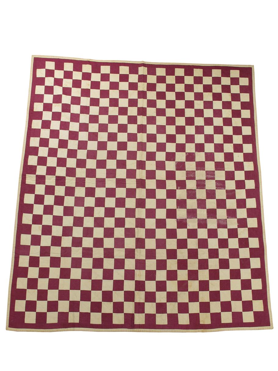 A chequer board quilt, in purple and cream, 90 x 78.5in (228.5 x 199.5cm).