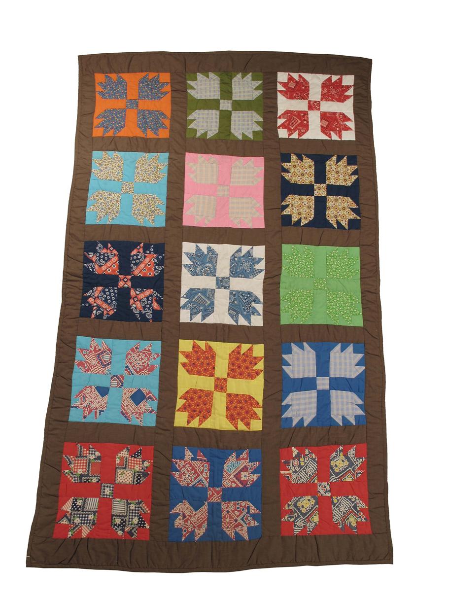 A twenty star quilt, each bordered with three further outer borders, 100.5 x 93in (255 x 236cm) and another with fifteen squares with stylized birds, 109 x 64in (277 x 162.5cm). (2)