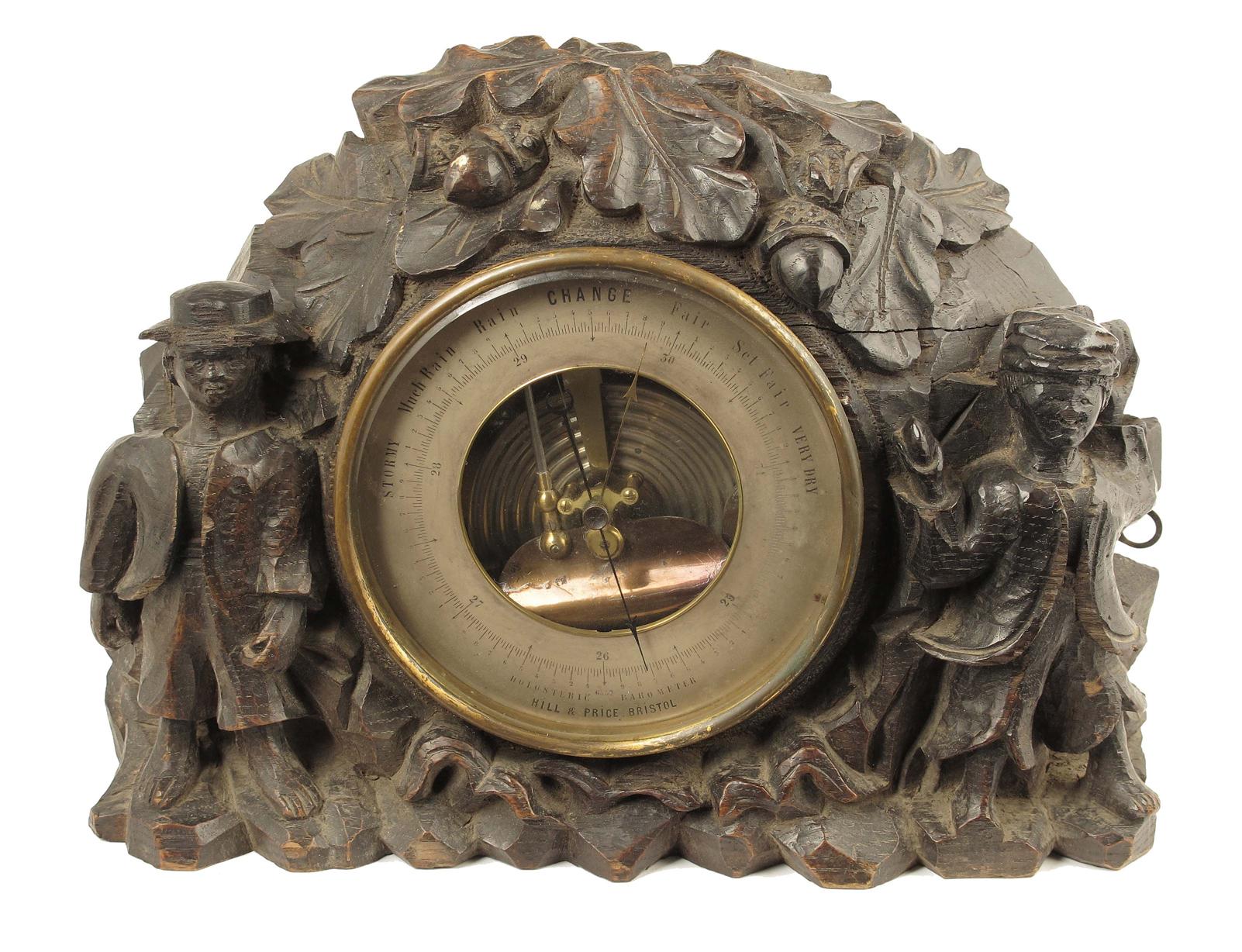 A late Victorian holosteric barometer by Hill & Price, Bristol, the carved oak case decorated with oak leaves and acorns and with two figures, the brass bezel to a silvered dial numbered '6557' and visible mechanism, 8in (20.1cm) h, 11.25in (28.3cm) w.