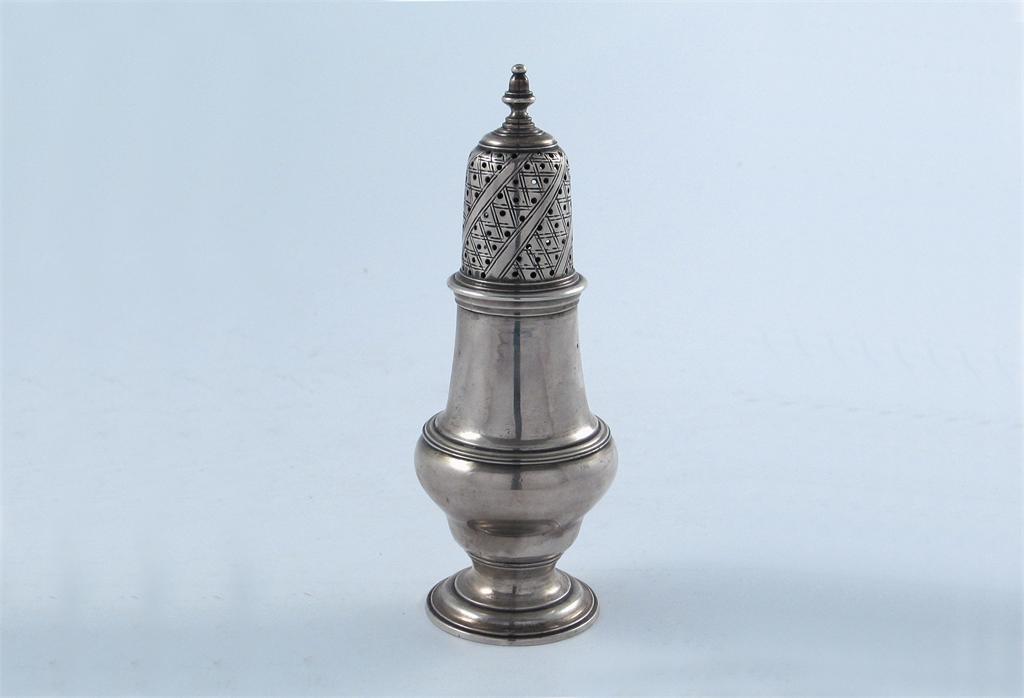 A George III plain baluster pepper caster, by an unidentified maker, "I.D.", London 1764, 5.5in (14cm) high, 3oz.
