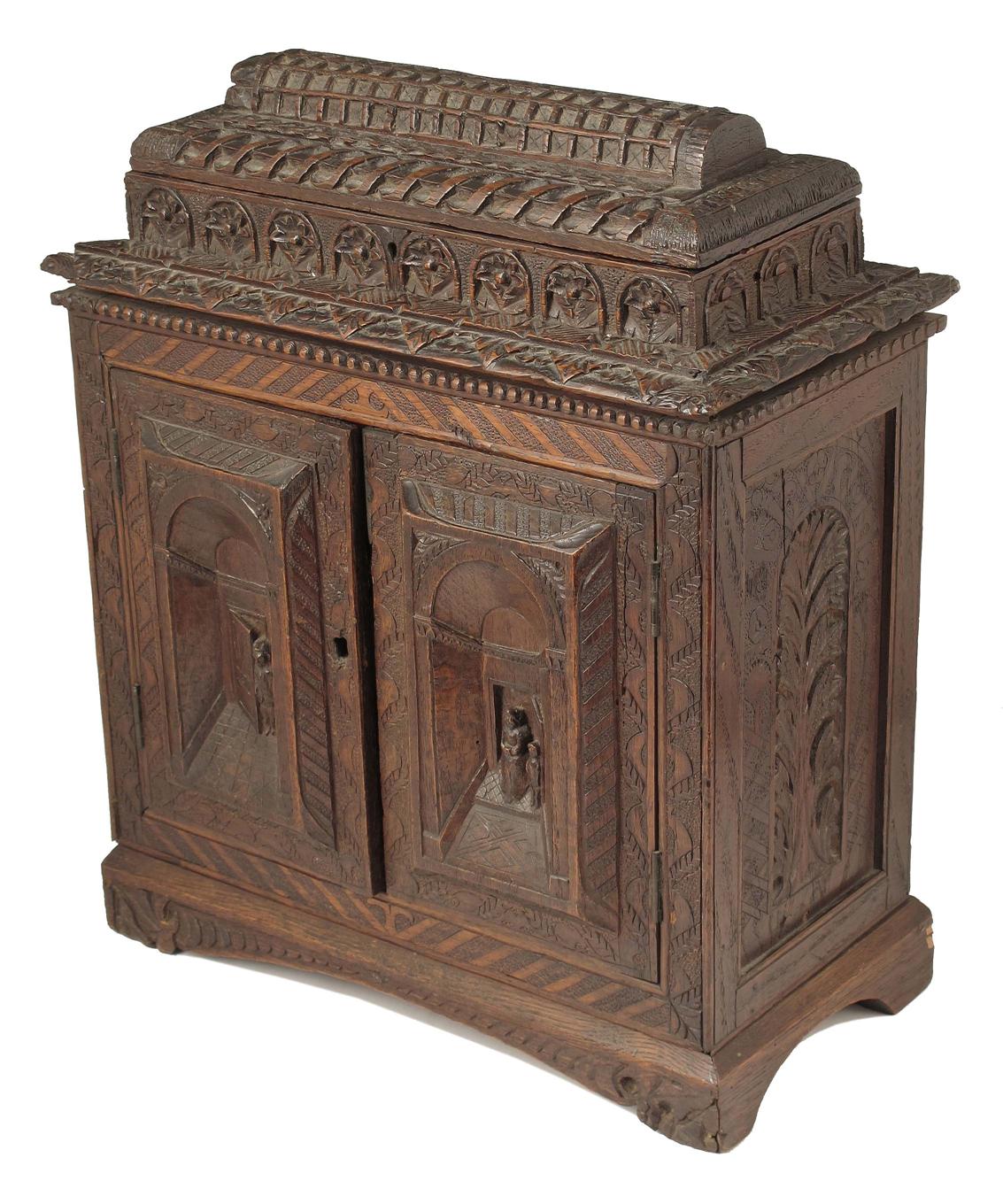 A 19th century carved oak cabinet, the lidded top with a domed ridge, having linen fold to one end above a petal carved frieze and edge, above a pair of panelled doors with recessed arches and carved figures in a doorway, enclosing plush lined shelves and a drawer, the panelled sides carved central stiff leaf within an arch, 17in (43cm) h, 14.5in (37cm) w, 8in (20.5cm) d.