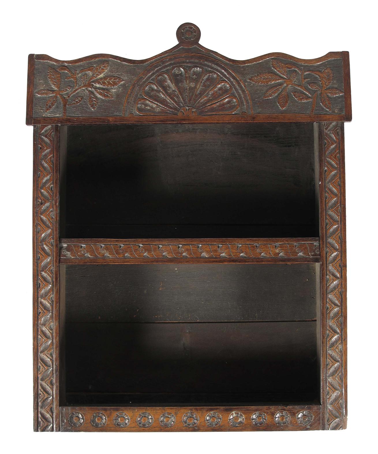 An oak wall shelf, with applied carved front above two shelves, 32in (81cm) h, 25.25in (64cm) w, 7.25in (18.5cm) d.