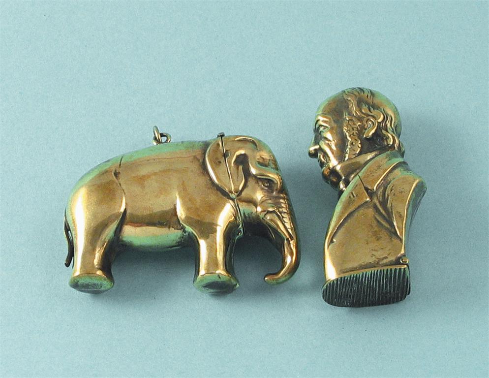 Two novelty brass vesta cases: one in the form of an elephant, one a portrait bust of Gladstone, (2).