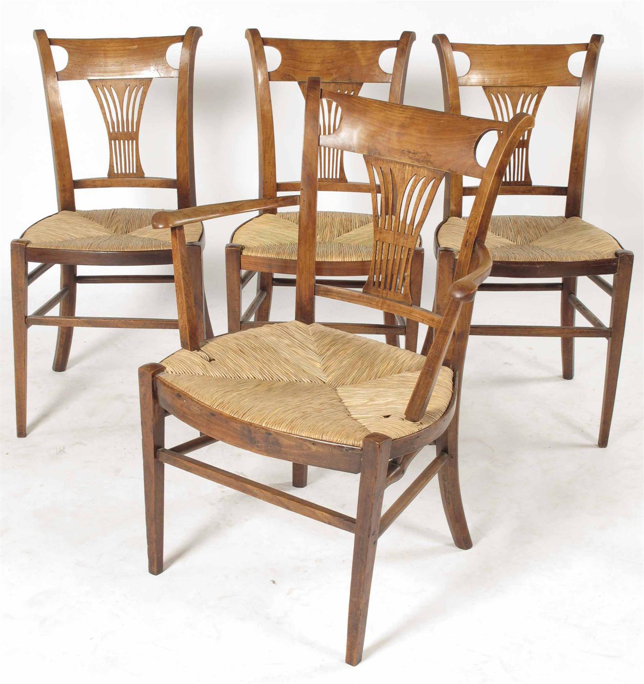 A set of four 19th century continental fruitwood chairs, each with a pierced splat back and a rush seat on square tapering front seats, comprising: an open armchair and three side chairs. (4)