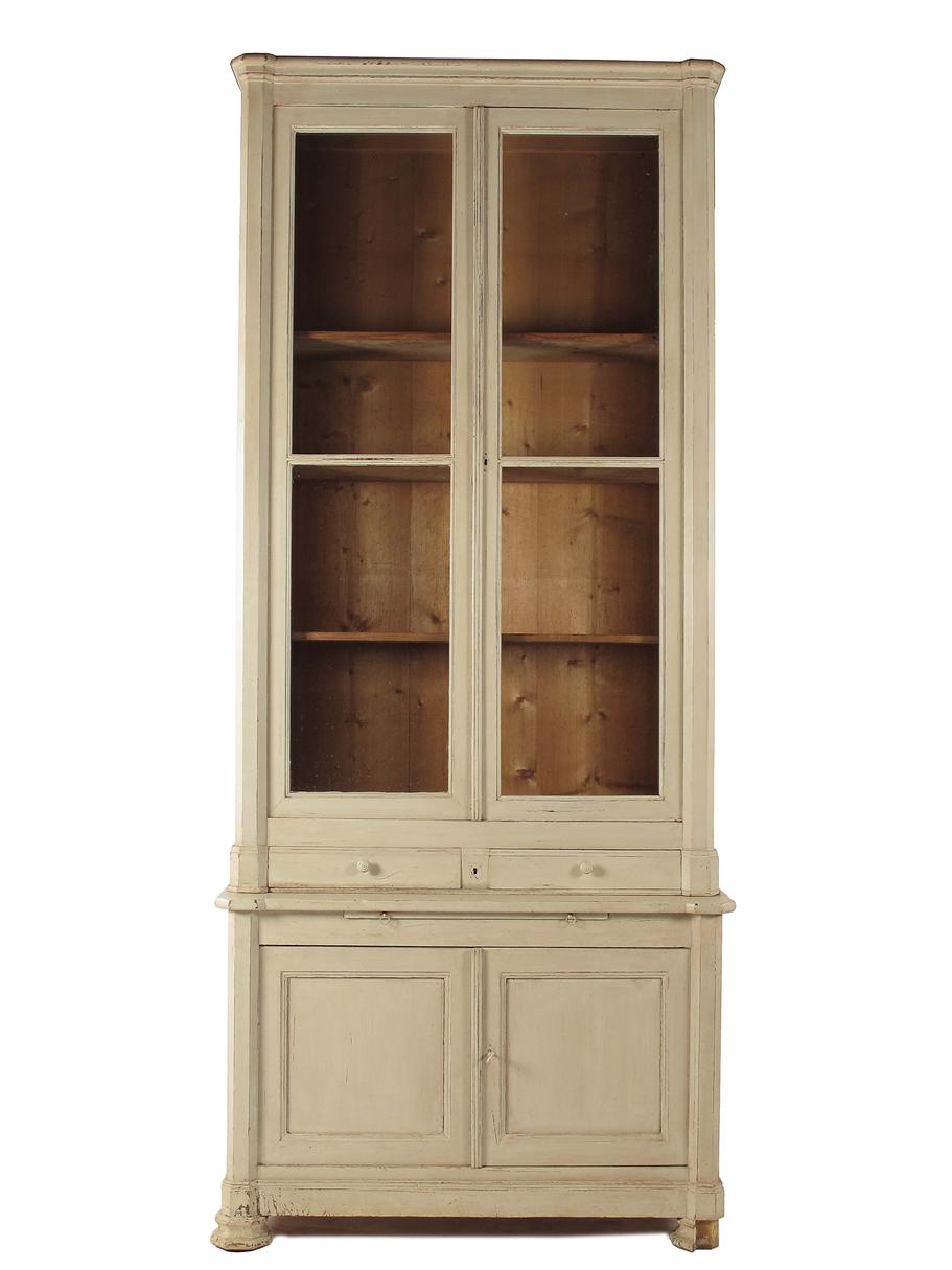 A pair of painted pine bookcases, each with a moulded cornice above a pair of astragal glazed doors enclosing adjustable shelves, to a pair of drawers above a slide and pair of panelled cupboard doors, 104in (264cm) h, 45.25in (115cm) w, 19.75in (50cm) w. (2)
