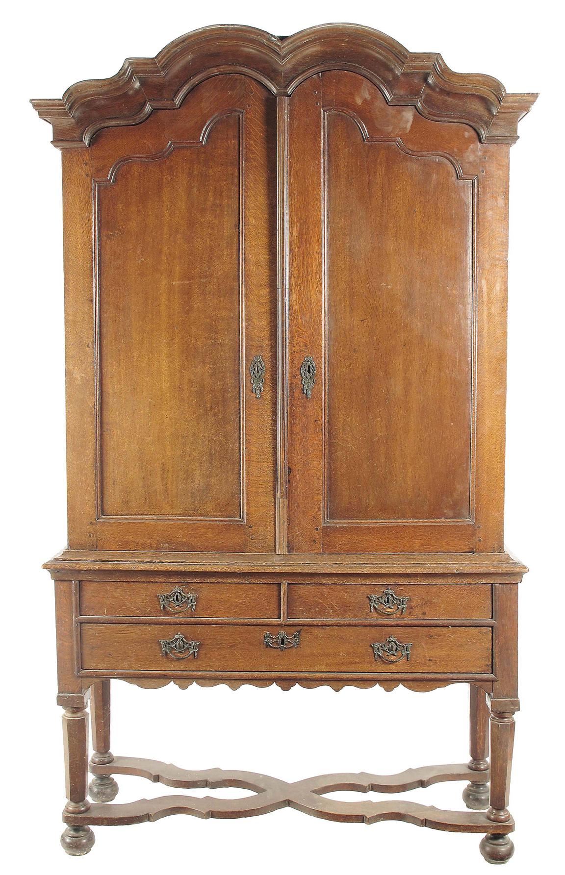 An 18th century Dutch oak cabinet on stand, the moulded shaped cornice above a pair of conforming panel doors revealing drawers and shelves, the stand with two short and one long drawer on tapering faceted legs united by a shaped 'X' stretcher and bun feet, 81.25in (206.5cm) h, 47in (119.5cm) w, 16.75in (42.5cm) d.