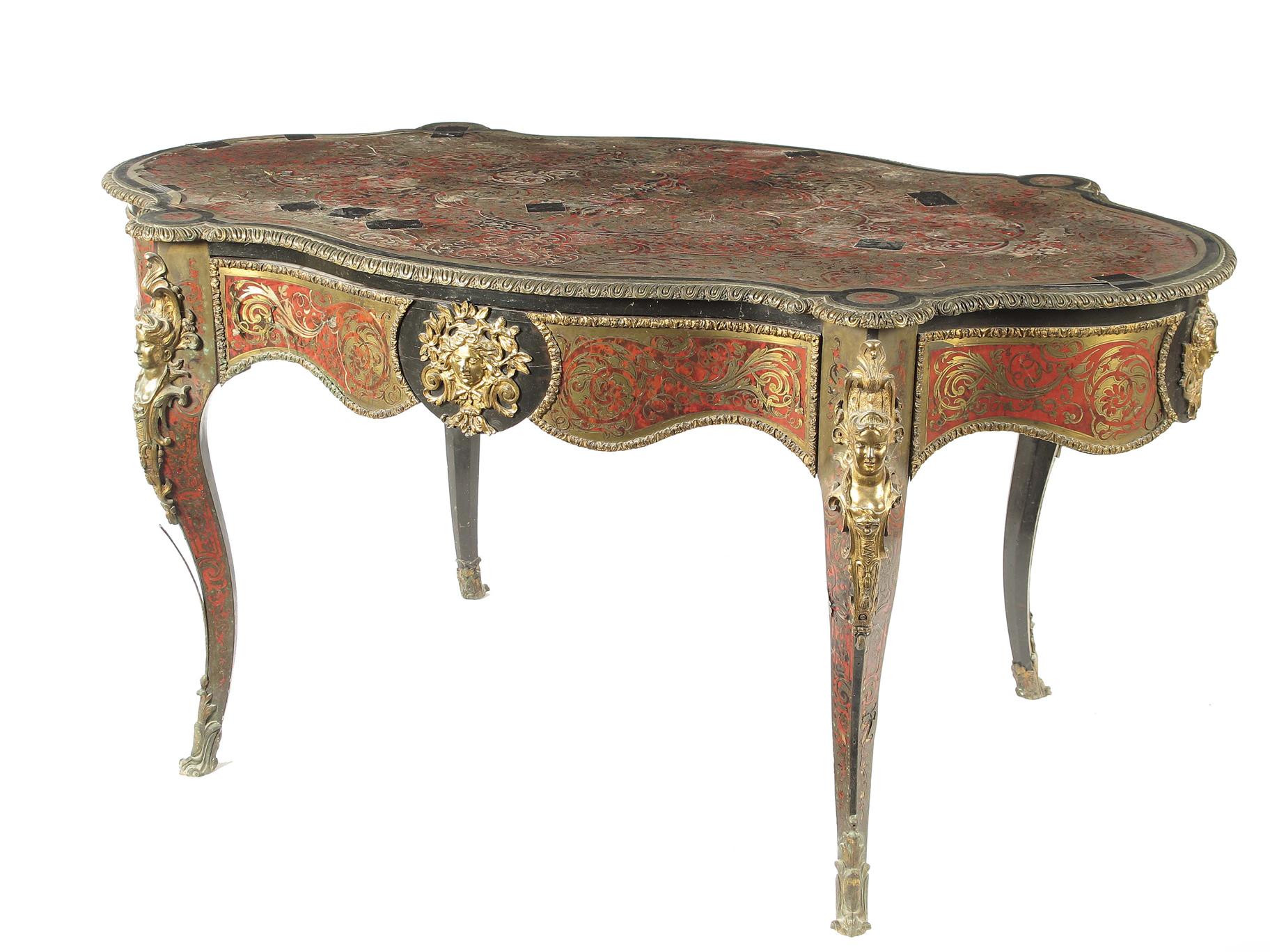 A Napoleon III ebonised, boulle marquetry and gilt metal mounted centre table in Louis XIV style, the serpentine moulded gadrooned edge top with foliate strapwork, above a frieze drawer centred an apollo mask on cabriole legs with espagnolette mounts terminating in foliate sabots, 29.5in (75.2cm) h, 60.5in (153.6cm) w, 33in (83.5cm) d. Brass lifting in places with losses, in need of restoration.