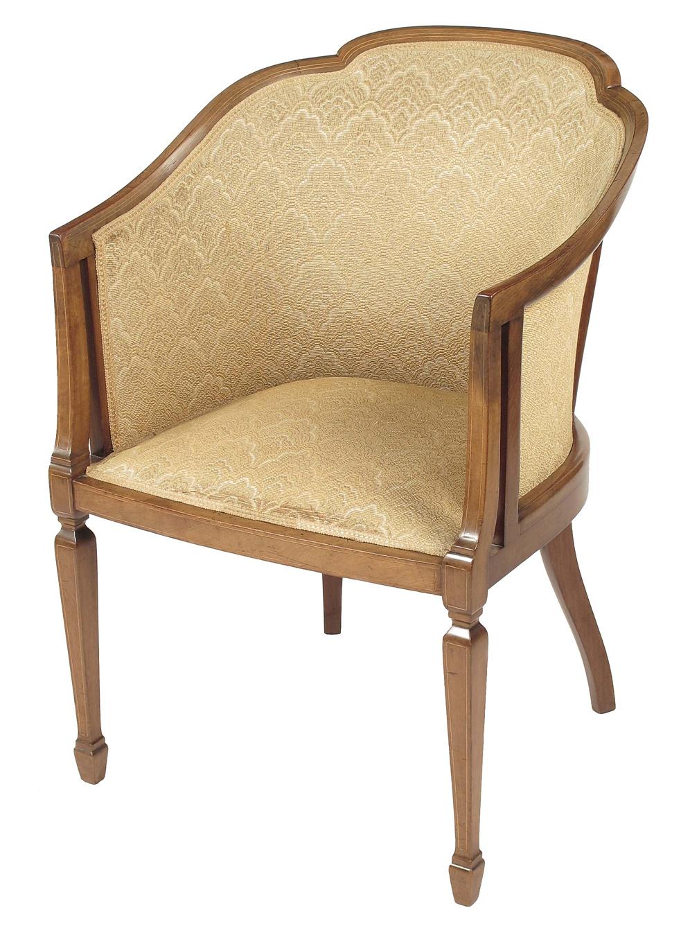 An Edwardian mahogany tub chair, inlaid boxwood stringing, on square tapering legs and spade feet.