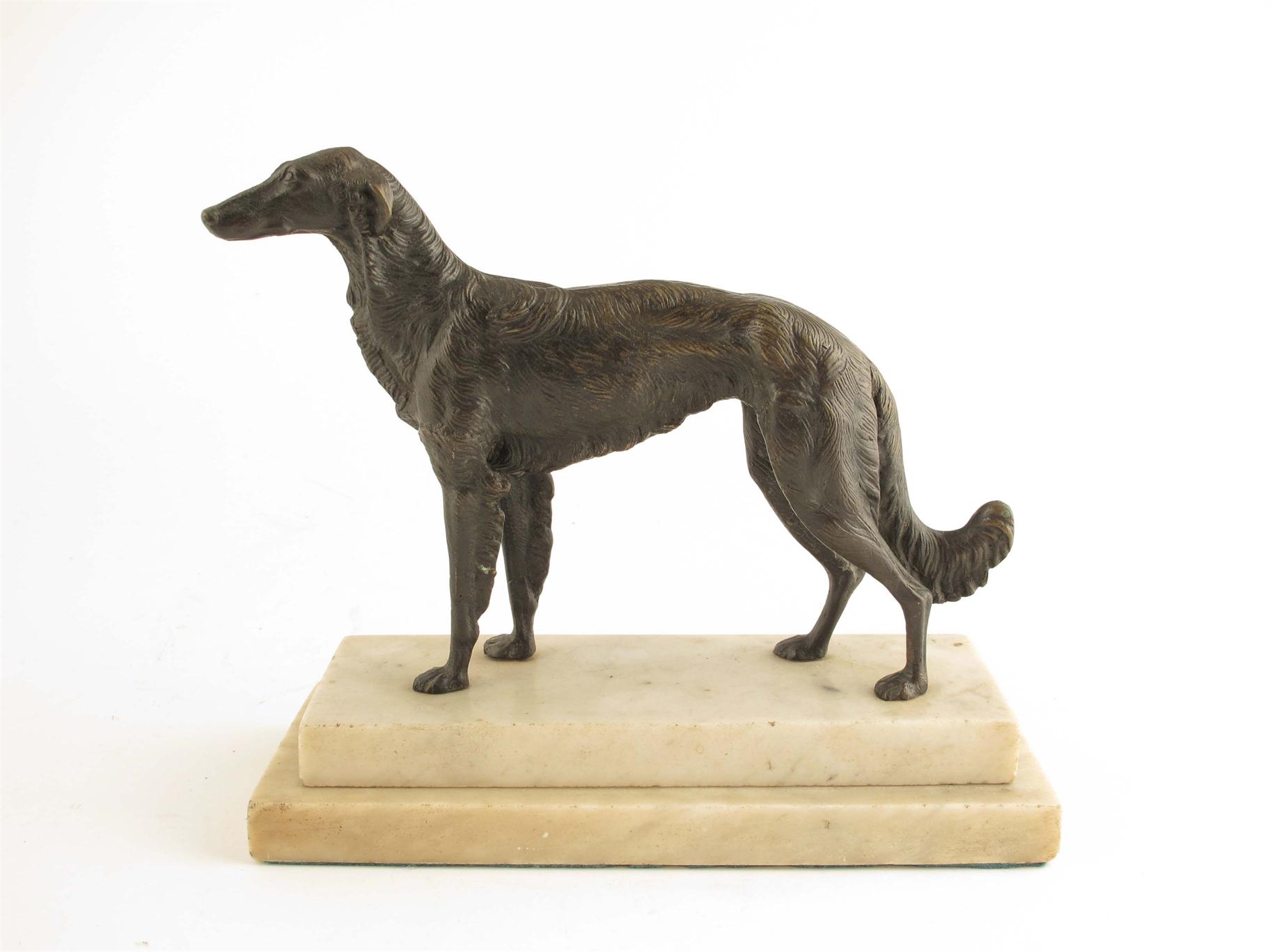 A French bronze model of a Borzoi Wolfhound, on a stepped white marble base, 8.25in (21cm) h, 9.5in (24cm) l.