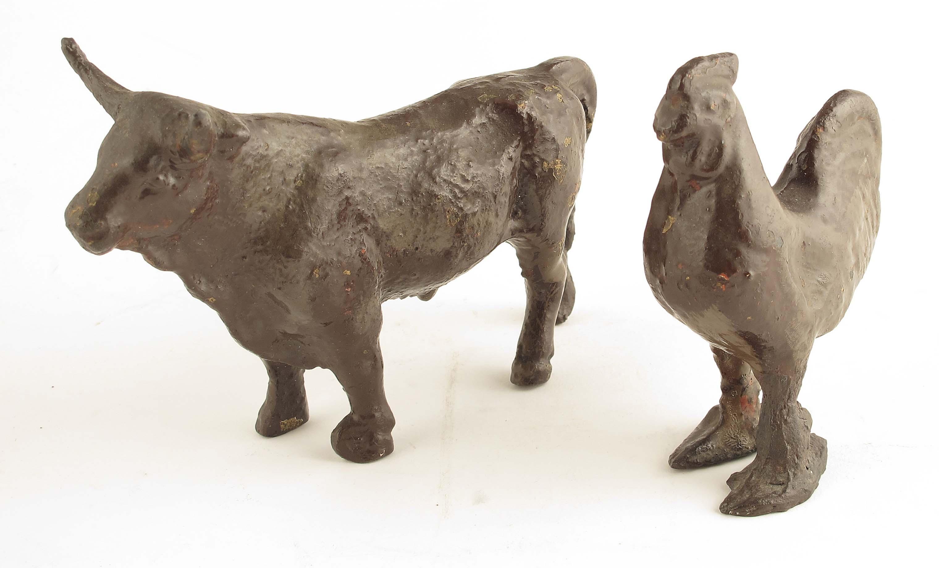 A cast iron model of a cockerel, later painted, 4.75in (12cm) h, 4in (10cm) l, and a similar model of a bull, 4.75in (11.5cm) h, 7.25in (18.5cm) l. (2)