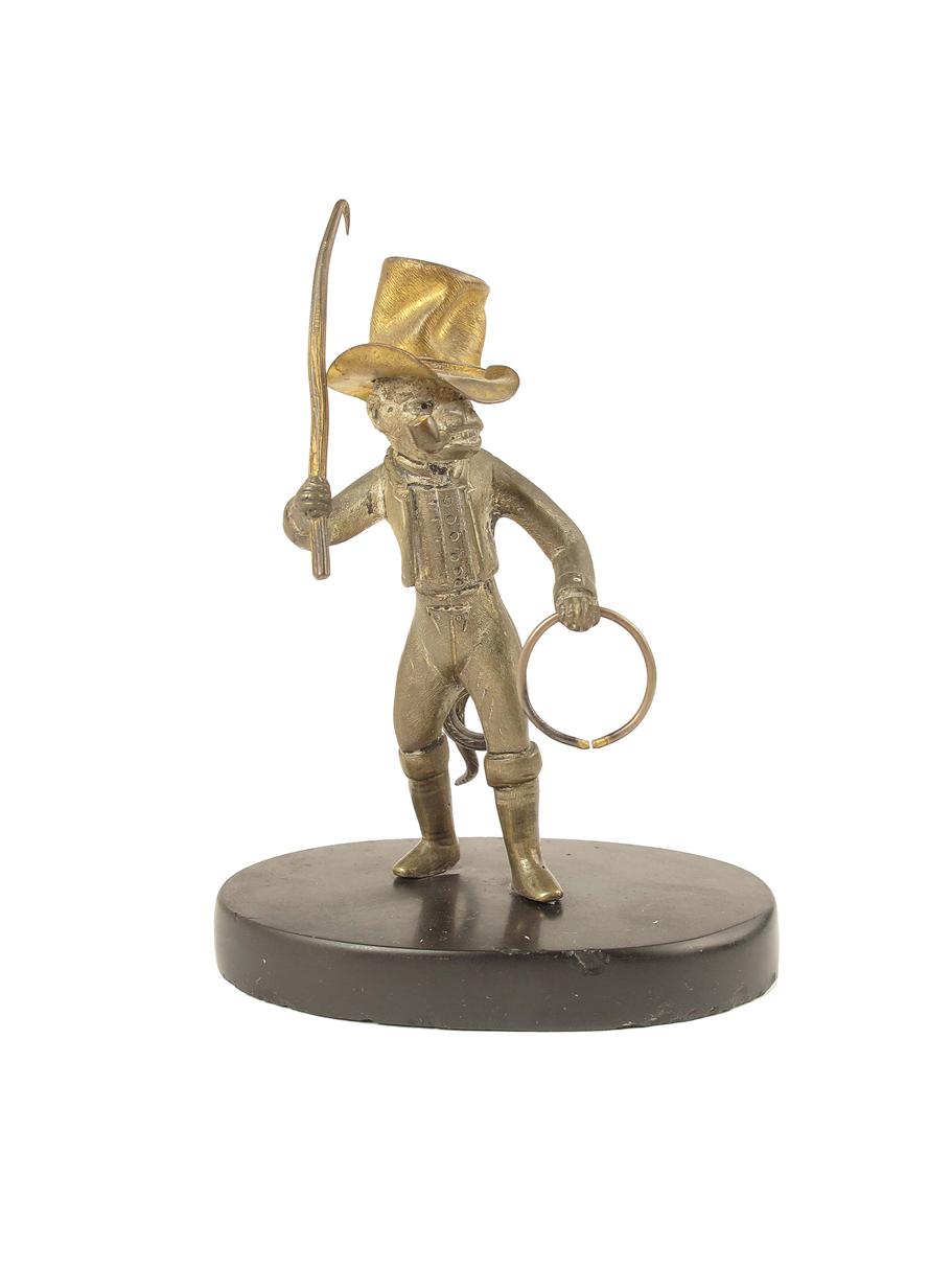 A late 19th century French parcel gilt bronze standing monkey, dressed as a Ringmaster, wearing a top hat and smoking a pipe, on an oval slate base, 5in (12.5cm) h.