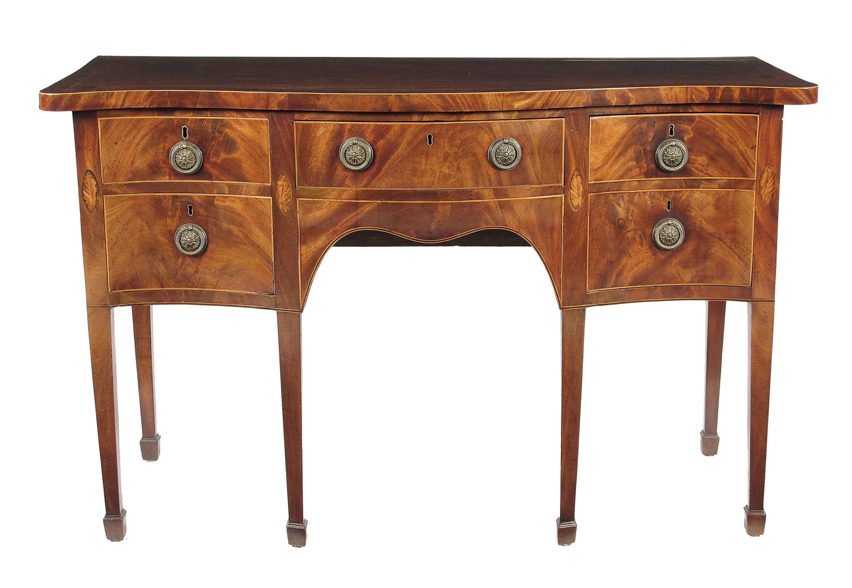 A George III mahogany serpentine sideboard of small proportions, inlaid boxwood stringing and marquetry paterae, the crossbanded top above a central frieze drawer flanked by a deep drawer with a later baize lined lift-out tray with a dummy front and two drawers to the other side with later lift-out divisions for cutlery fitted replaced brass ring handles, on tapering legs to spade feet, 36.5in (92.4cm) h, 57.5in (146.2cm) w, 24.25in (61.7cm) d.