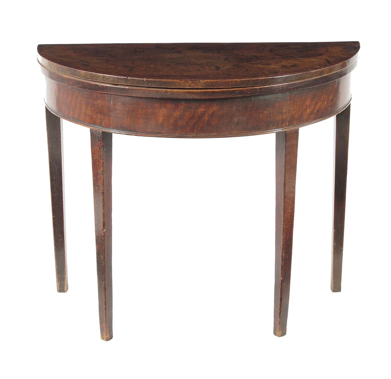 A George III mahogany demi-lune tea table, the fold-over top to twin gate supports, 27in (68.7cm) h, 33in (83.8cm) w, 16in (40.5cm) d.