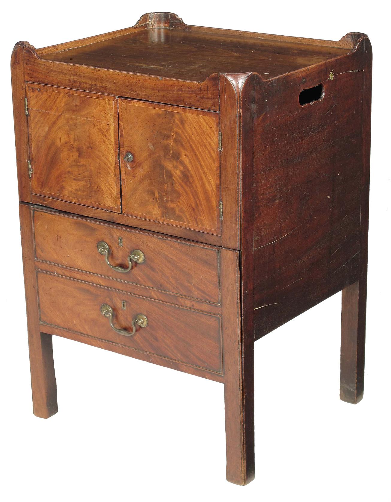 A George III mahogany 'tray top' bedside commode, with a replaced top above a pair of cupboard doors with crossbanding and stringing, above a converted pull out base drawer, pierced side handgrips, 30.5in (77.5cm) h, 21in (53cm) w, 18in (46cm) d.