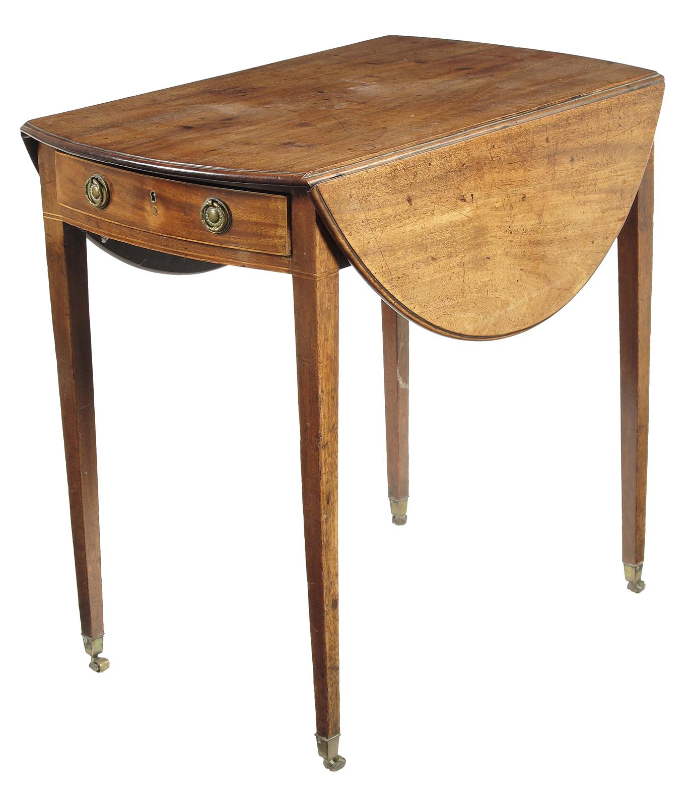 A George III mahogany Pembroke table, the moulded edge oval drop-leaf top above a frieze drawer fitted later brass ring handles, with a false front to the reverse, on square tapering legs and later brass caps and roller castors, 28in (71cm) h, 37in (94cm) w, 29.75in (75.5cm) d. Repairs to legs.
