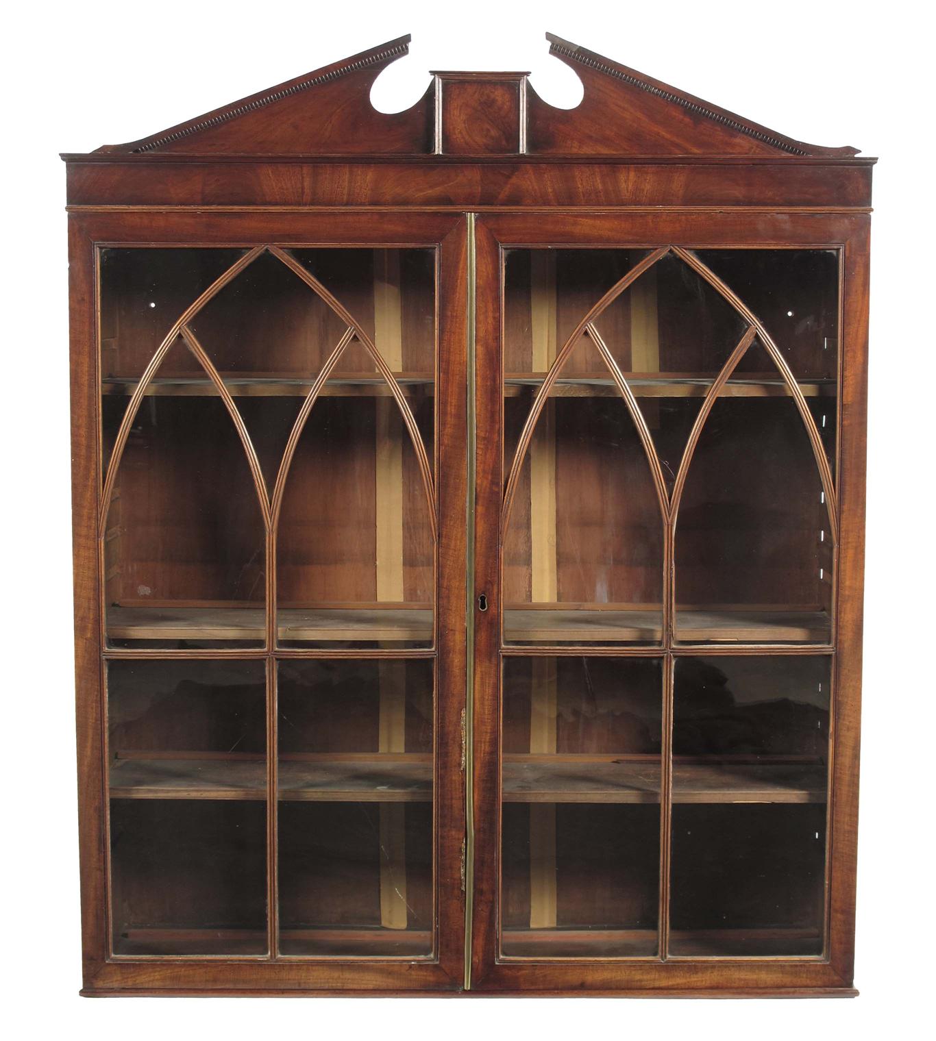 A mahogany bookcase, the detachable broken pediment above a pair of lancet shape astragal glazed doors enclosing three adjustable shelves, George III previously the top of a secretaire, 50in (127cm) h, 41.5in (104.7cm) w, 12in (30.1cm) d.