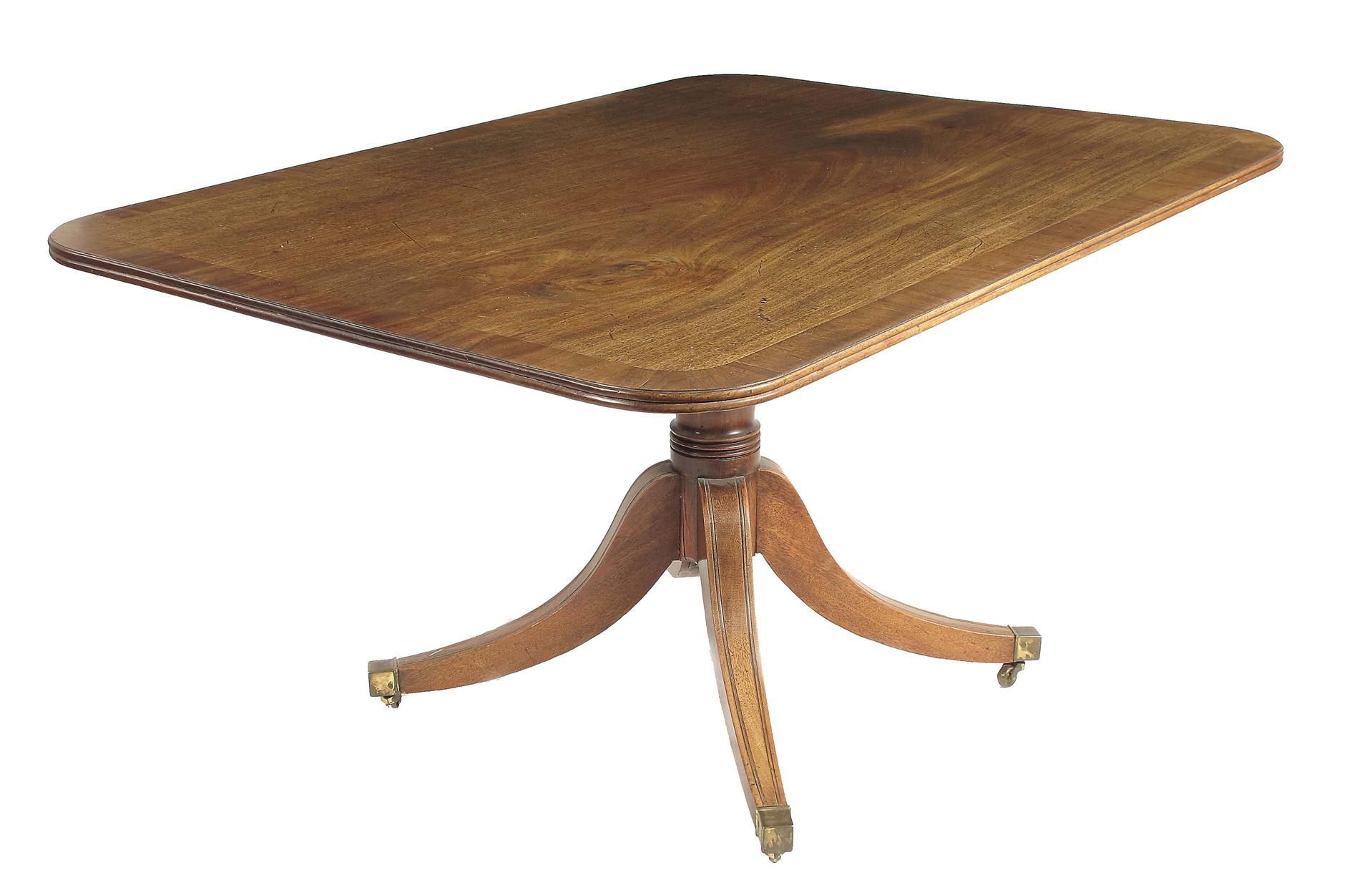 A late George III mahogany breakfast table, the crossbanded and reeded edge tilt-top above a turned stem and four chanelled splay legs, brass caps and castors, with retailers plaque 'KERRIDGES, UPHOLSTERERS & FURNISHERS, HAILSHAM', 29.5in (74.7cm) h, 54in (137cm) w, 39.5in (100cm) d.
