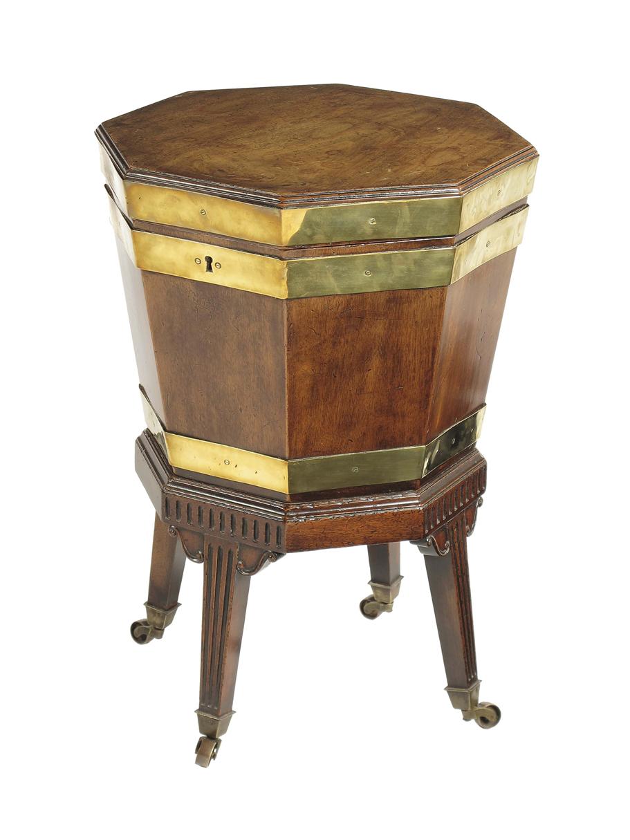 A mahogany and brass bound octagonal wine cooler in George III style, the hinged top to a lead line interior, the tapering body to a fluted frieze and bracketed fluted legs terminating in brass caps and castors, 2nd haf 19th century, 25.5in (64.3cm) h, 18.5in (46.8cm) w.