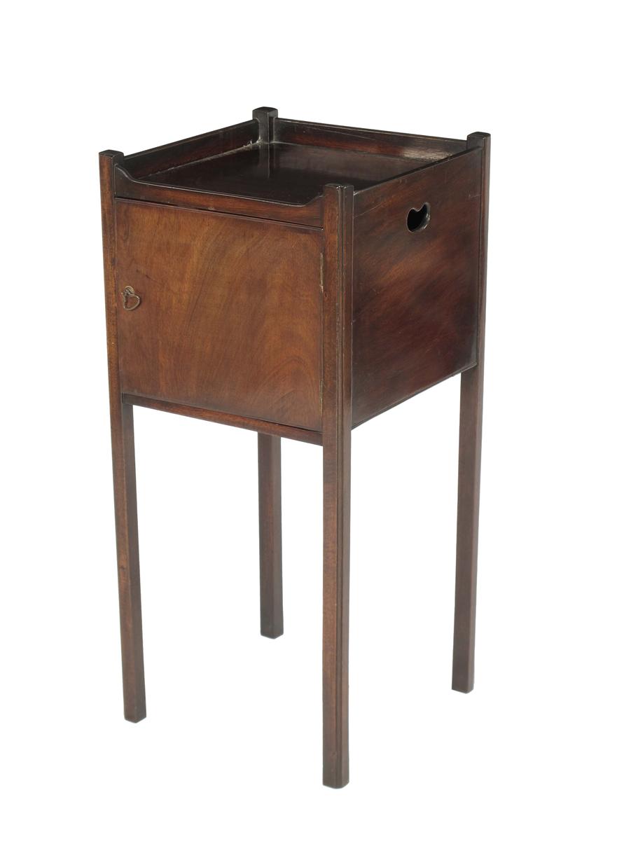 A mahogany pot cupboard, the sides with pierced handgrips, on chanelled supports, 30in (76.3cm) h, 13.75in (34.7cm) w, 14in (35.3cm) d.