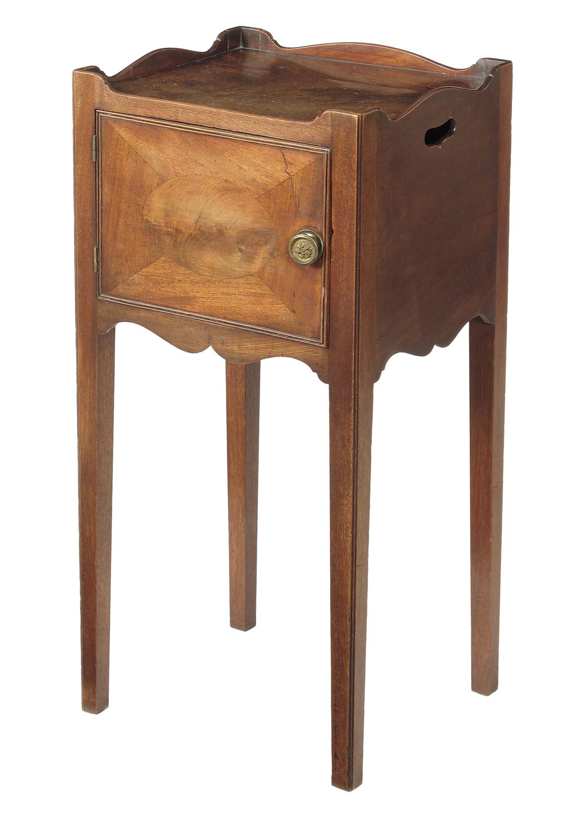 A George III mahogany bedside cupboard, with a shaped galleried top above pierced hand grips to either side, the door with an oval panel and reeded mouldings above arc d'arbelet aprons and moulded square tapering legs, 30.75in (77.9cm) h, 15in (38cm) w, 13.75in (35cm) d.