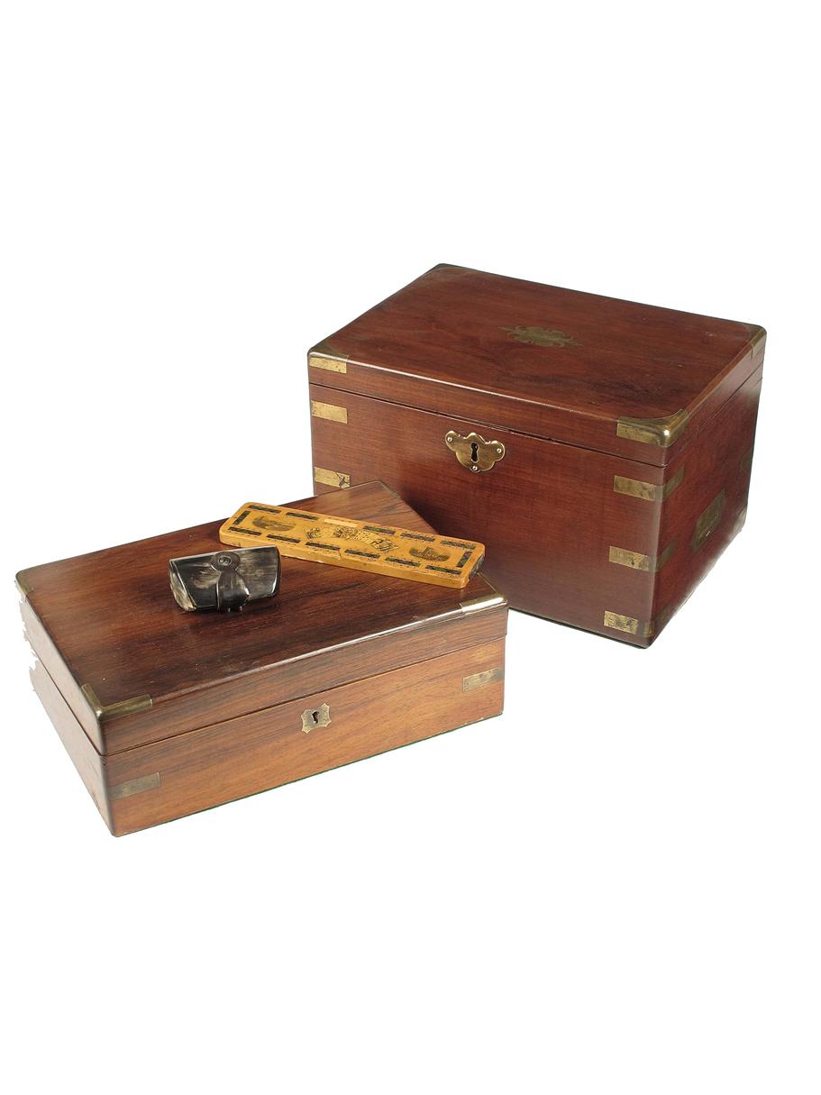 An early 19th century mahogany and brass bound travelling jewellery box, the hinged cover inset a plaque inscribed Mrs J.T.Hill, sunken brass side handles, the leather, paper and plush lined interior with a lift out tray, with a brass Chubb's Patent lock, no. 8287, 9in (23cm) h, 14.25in (36cm) w, a Victorian rosewood writing slope, a Mauchline ware cribbage board and a horn purse. (4)