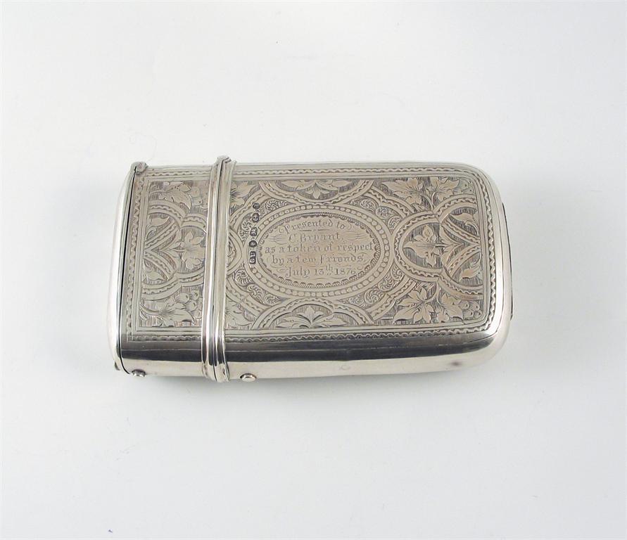 A Victorian engraved cheroot case, with a hinged cover, initialled 'C B', which is in turn hinged to form a vesta compartment, inscribed on one side 'Presented to C Bryant as a token of respect by a few friends, July 13th 1876', by George Unite, Birmingham, 1875, 4.9in (12.2cm), 4.75oz.