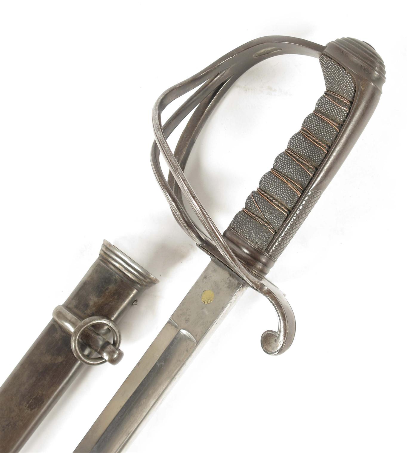 An 1822 pattern dress sword, the fullered slightly curved blade stamped 'W. WALSCHEID, SOLINGEN', to an open steel guard and a shark skin grip with scabbard.