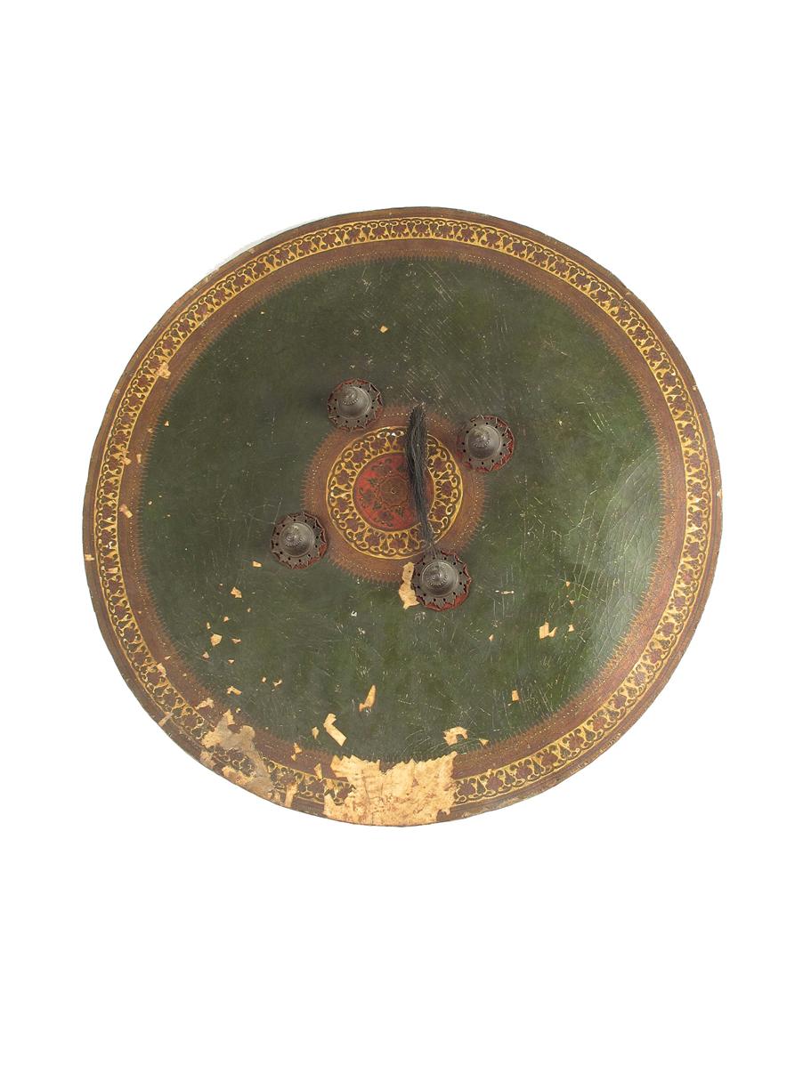 A 19th century Indian painted hide dhal, the exterior with four bronze bosses, 24.5in (62.3cm) dia.