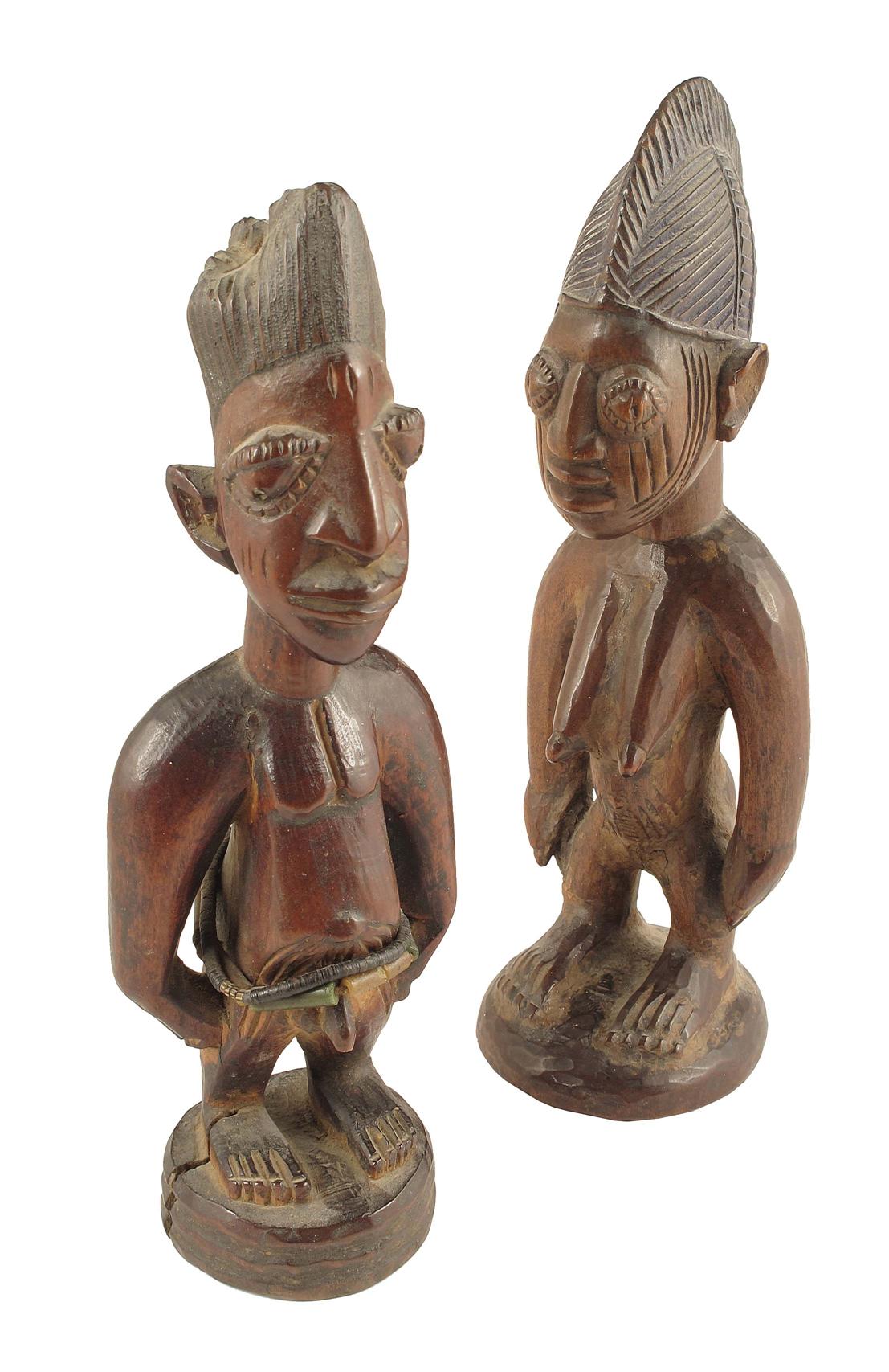 Two Yoruba Ibeji figures, the male with two bead bands, the female with blue pigments to her coiffure, 10.75in (27.5cm) h. (2)