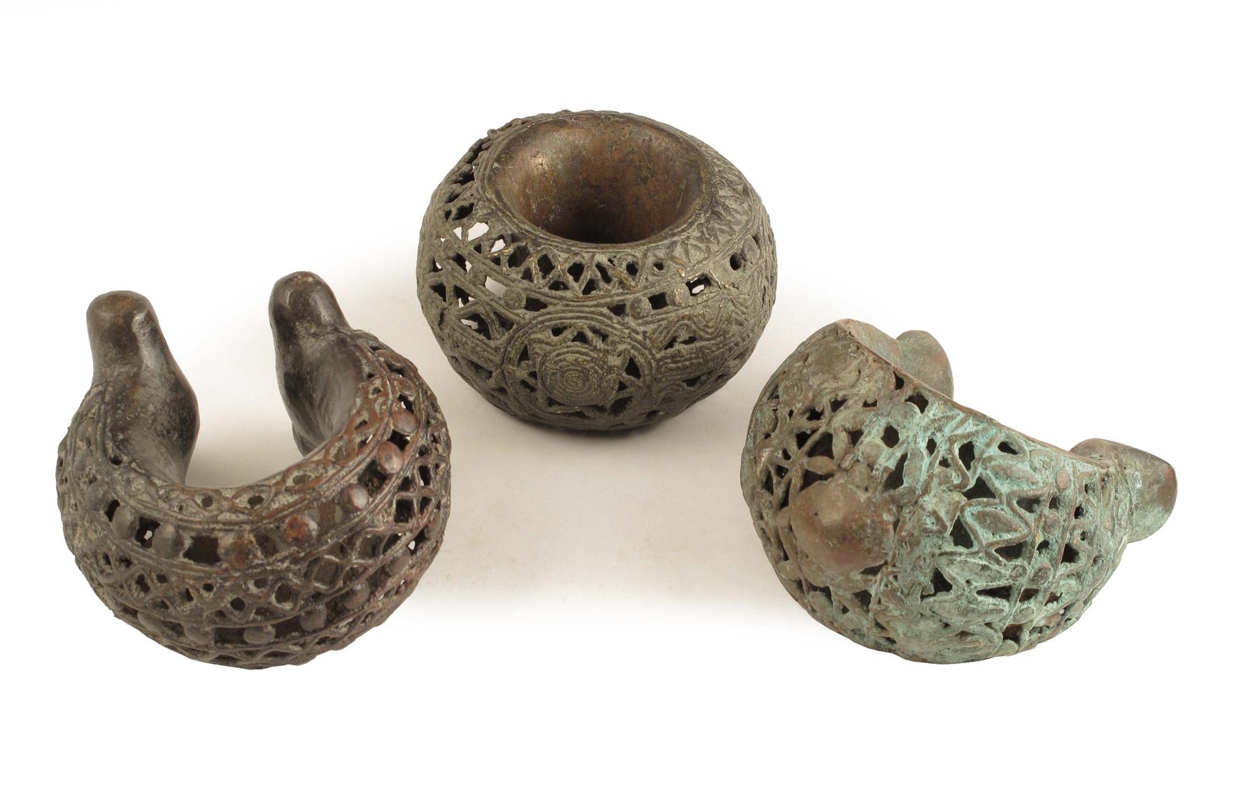 Two African pierced and hollow bronze crescent shape bangles, and another similar bangle. (3)