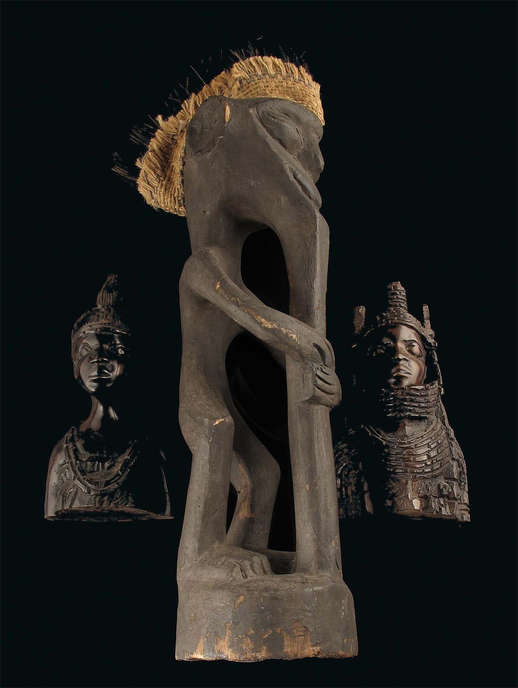 A Benin style carved wood bust, 8in (20cm) h, another hardwood bust and an ebonised figural carving. (3)