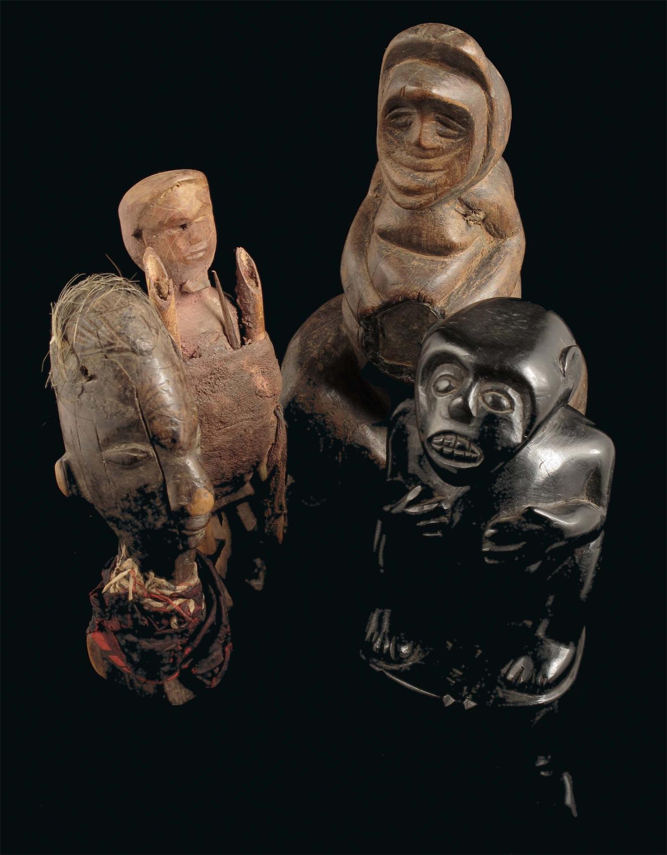 An African carved wood seated figure, with an inset glass plaque to her abdomen, 9.25in (23.5cm) h, a carved figure with cloth wrapped around three spikes, an ebony seated monkey and a carved bust with applied hair. (4)