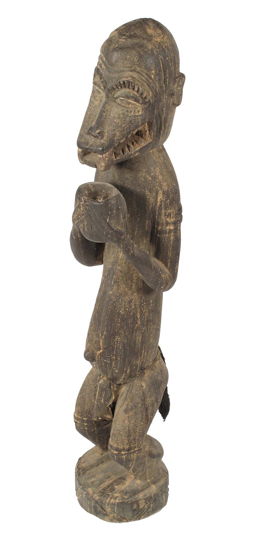 A Baule Gbekre standing figure, the head carved with serrated eyebrows and an open mouth bearing teeth and two fangs, holding a bowl to it's mouth, 41in (104cm) h.
