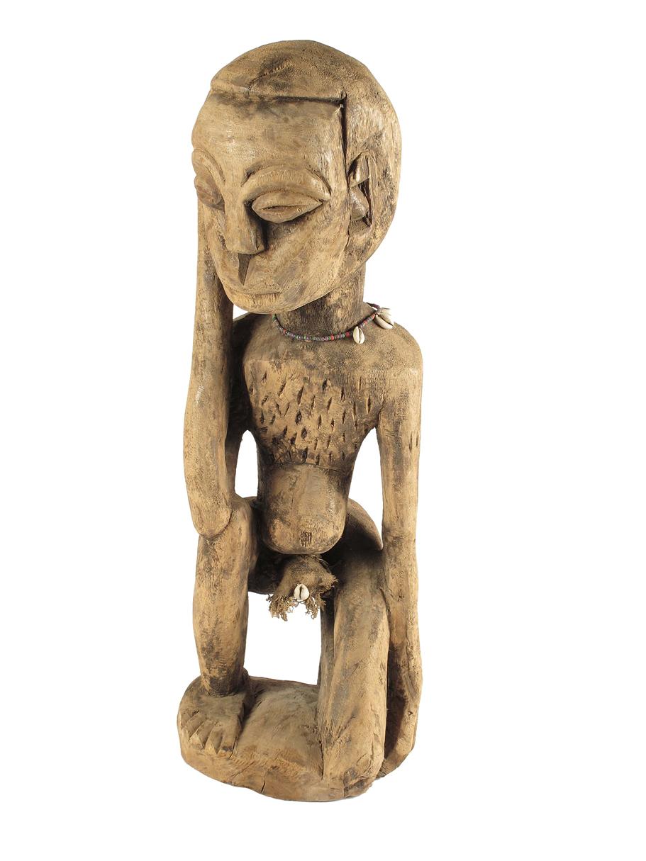 An African carved crouching male figure, with bead and shell necklace and a loin cloth, 25in (63.5cm) h.