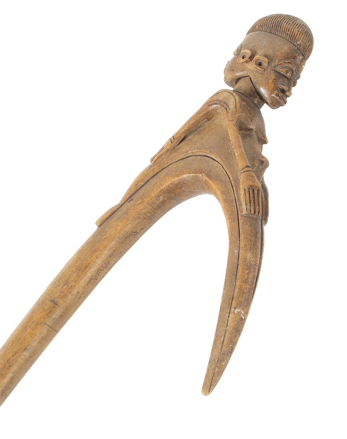 A West African staff, of hooked beak form, the terminal carved a male and female figure sitting back to back, 41in (104cm) l.