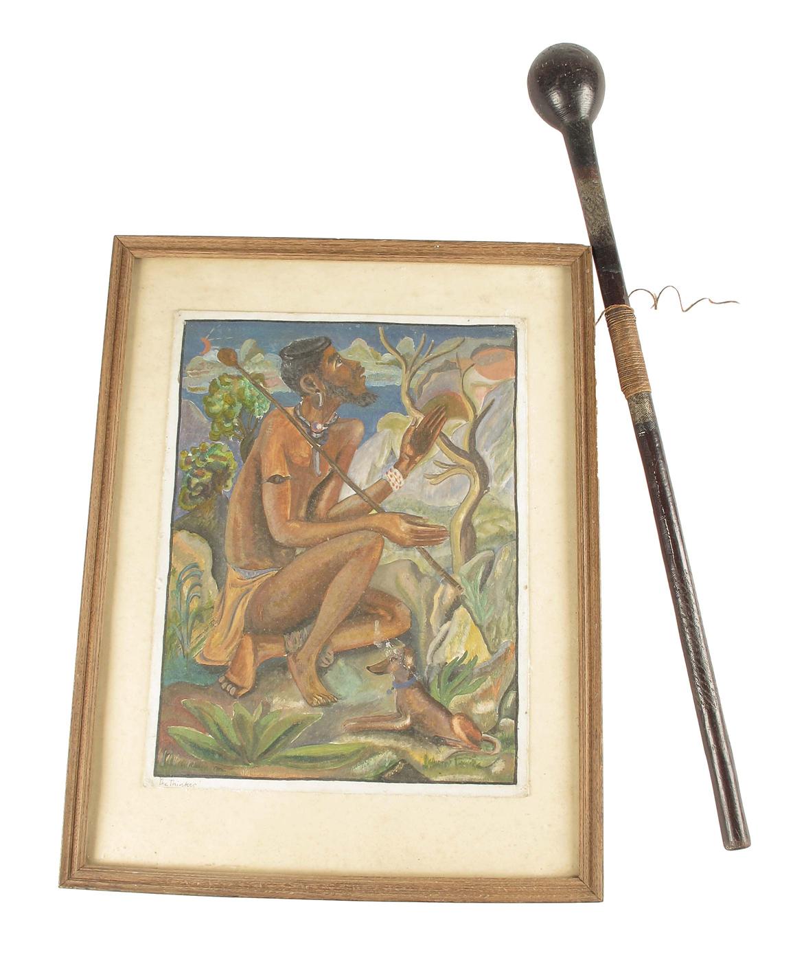 Stephen Katsande (Zimbabwean, mid 20th century). The Thinker, oil on canvas, 15.75 x 11.75in (40 x 29.9cm), framed and glazed, the reverse inscribed 'The Thinker, by Stephen Katsande (his first attempt in oils)', together with a Zulu knobkerrie similar to the one featured in the painting, with a polychrome decorated and scarified handle, 28.25in (71.6cm) l. (2)