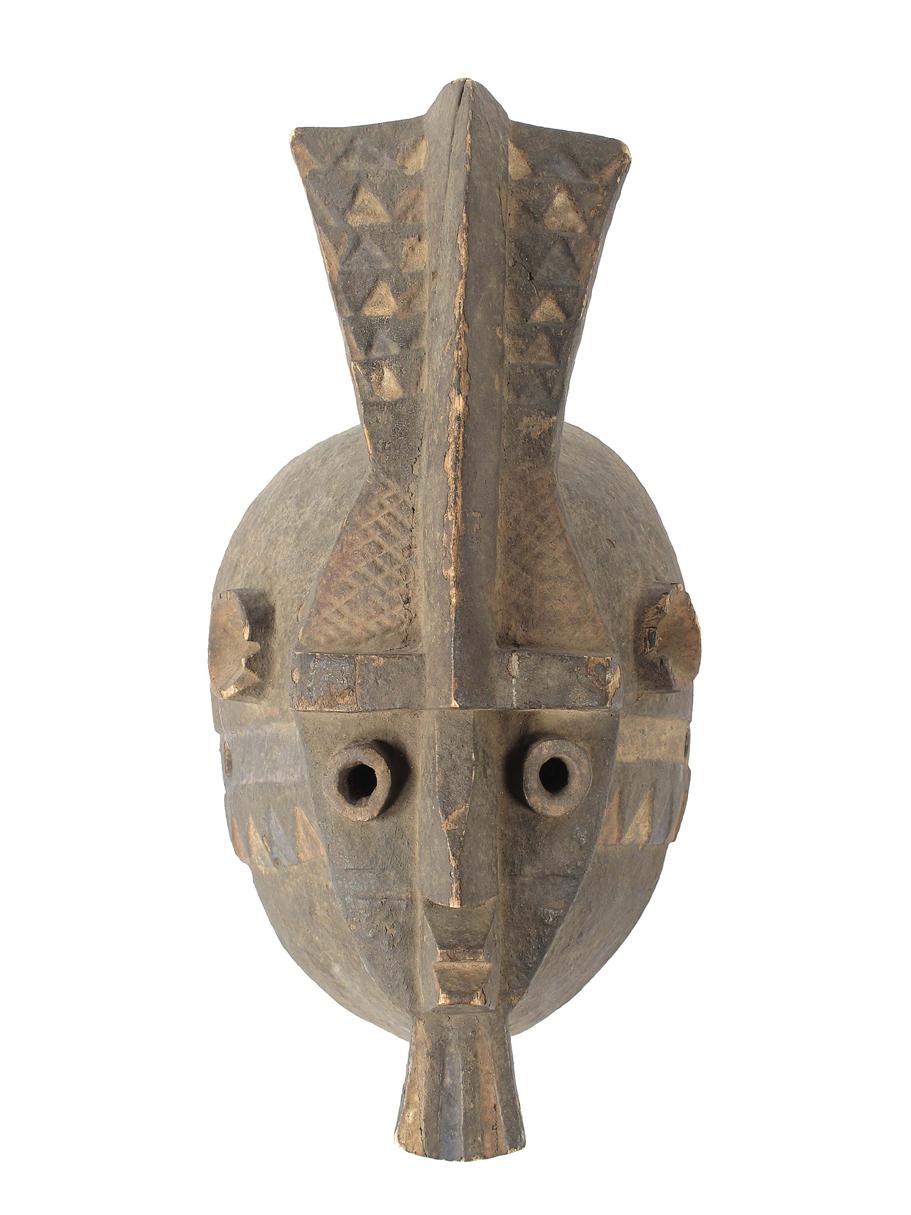 A Mossi mask, Burkina Faso with an ebonised ground with red, blue and white pigment to the triangular headpiece and short beard, two fastening holes to the sides, 17.5in (44.5cm) h.