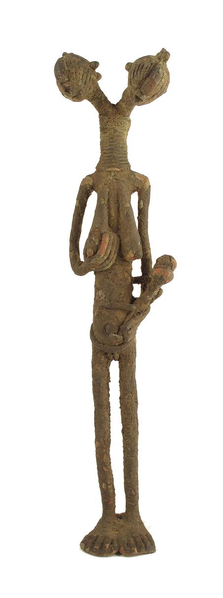 A West African metal two headed female figure, standing holding her right breast and a two headed infant, 12.5in (32cm) h.