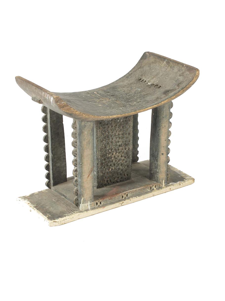 An Ashanti stool, with a dished seat, central column support with arch decoration, four further supports with scallop edges, the rectangular base later painted, 18.5in (47cm) h, 25.5in (65cm) w.