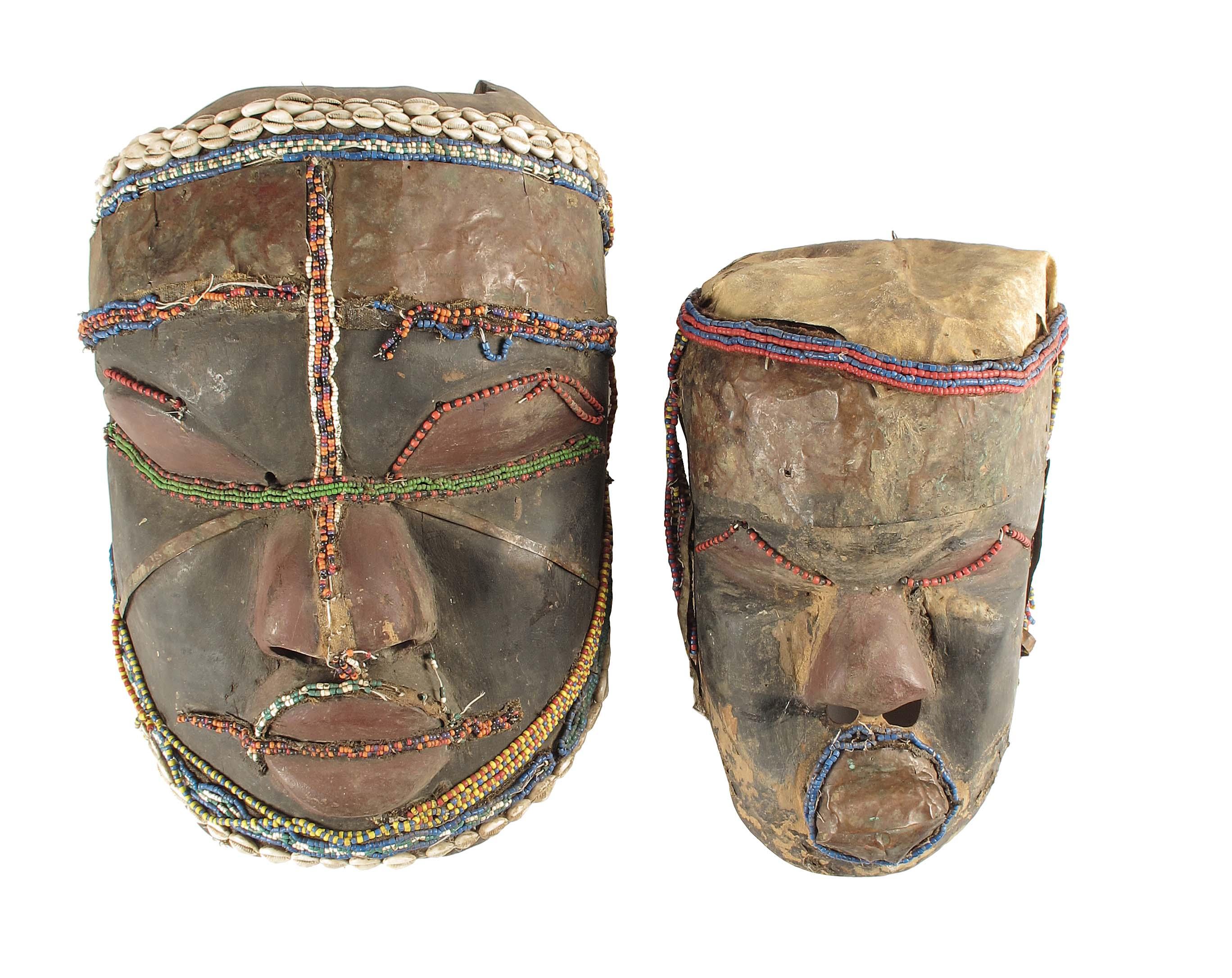 A West African large mask, with applied copper, beads and shells with an ebonised ground and painted red features, 17.5in (44.5cm) h, and another similar smaller mask. (2)