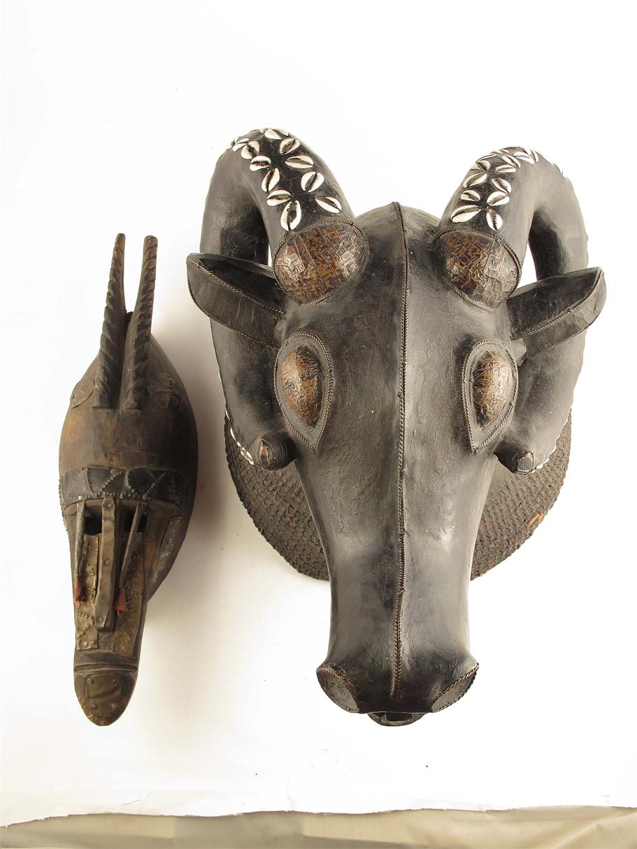A Bambara mask, with metal mounts and cloth, 17.75in (45cm) h, and another headdress, of bovine form with cowrie shell inlay and bopper mounts, with a woven fibre support edge, 18in (46cm) h. (2)
