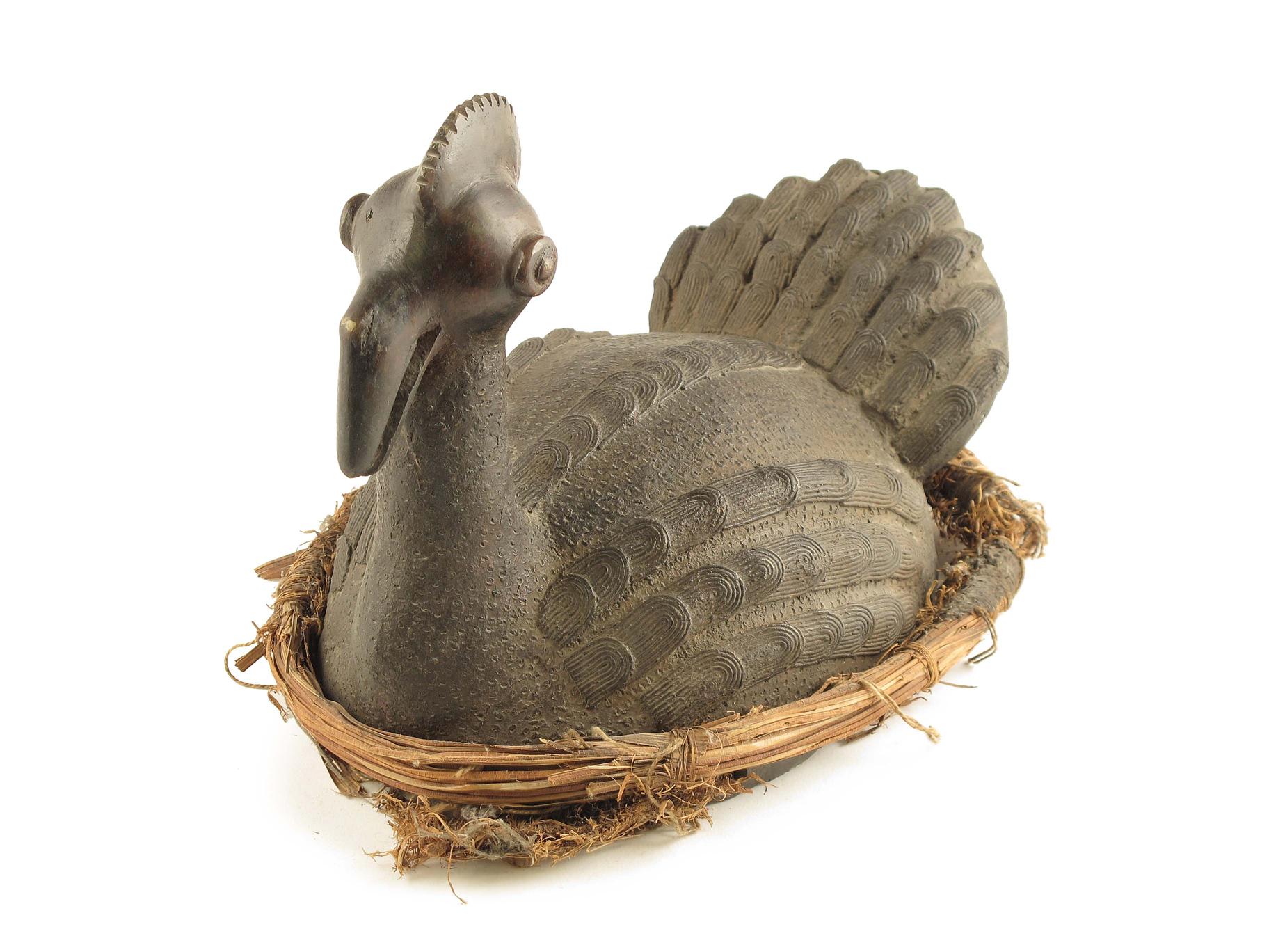 A Yoruba cast brass bird headdress, realistically modelled with a pierced band with fibre mount, 11in (28cm) l. Provenance: Evard De Rouvre Collection, Paris. M. Jean-Luis Sonnery - purchased in May 1978.