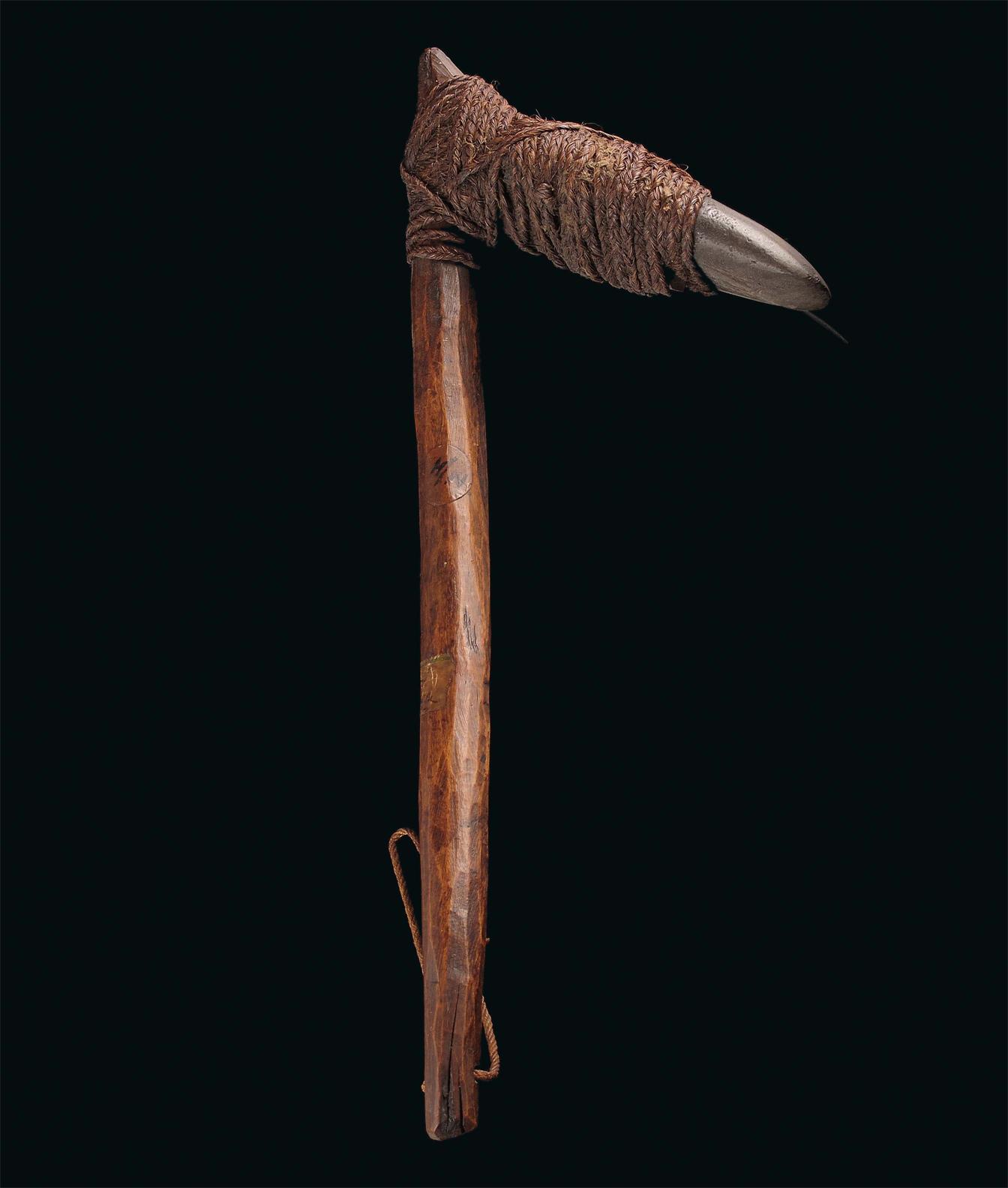 A Sepik adze, wood, stone and coir, with written inventory and identification stickers, 15.75in (40cm) l.