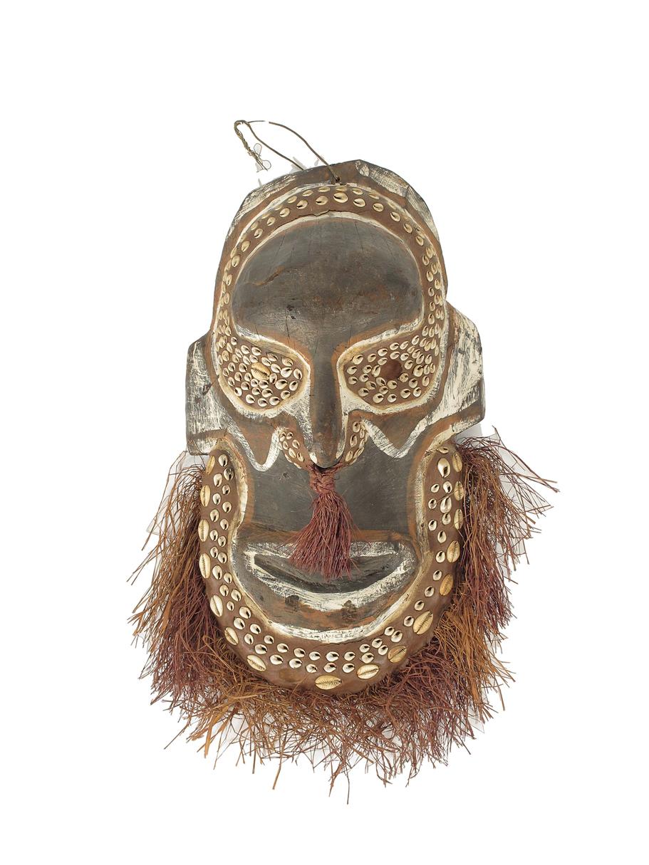 A Sepik mask, carved wood with shells in set to clay with fibre beard and nose knot, 16in (43cm) h.