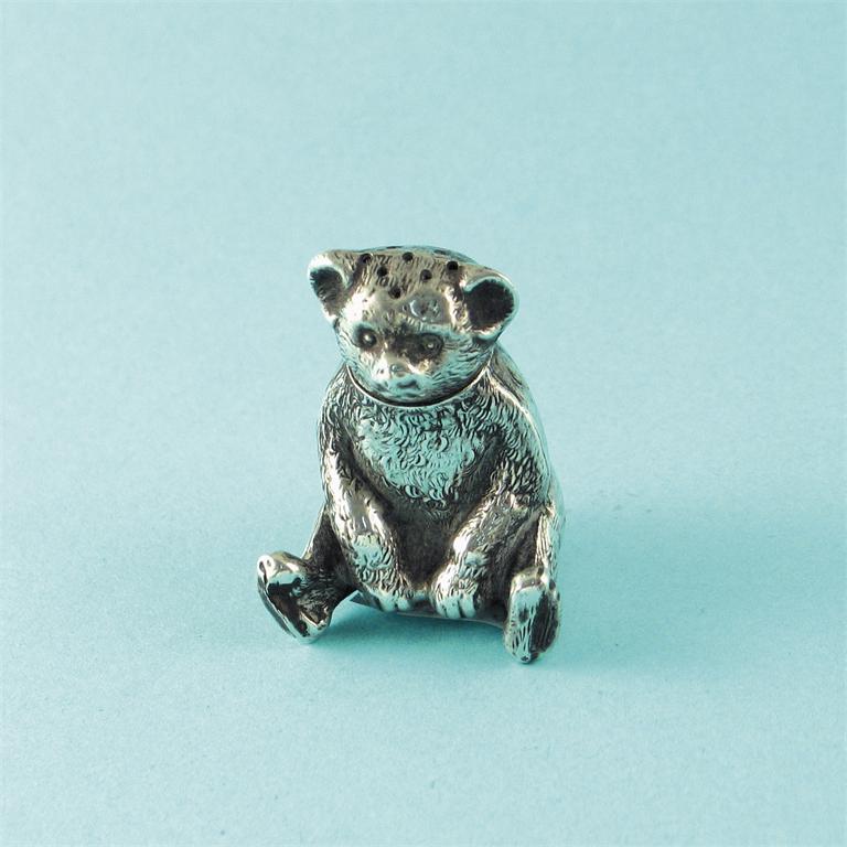 An Edwardian novelty pepperette, in the form of a seated teddy bear, by Grey & Co., Birmingham, 1909, 1.5in (4cm).