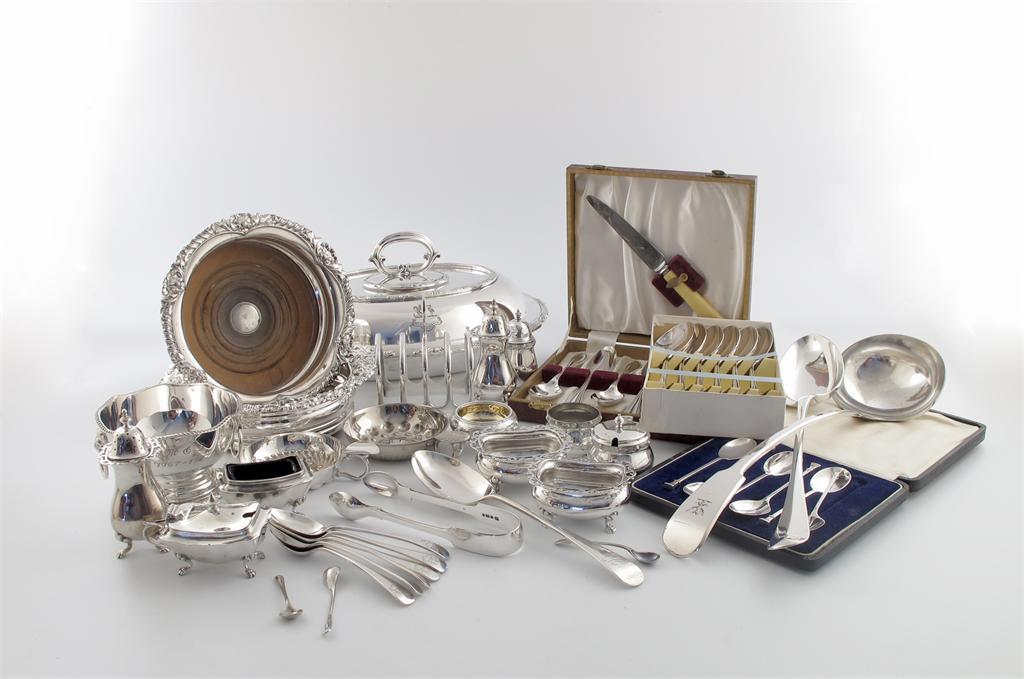comprising silver items: a cased set of six teaspoons, a pair of salt cellars, a pair of pepper pots, a mustard pot, a salt cellar, plus six teaspoons, a table spoon, and three condiment spoons, plus electroplated items, two wine coasters, an entree dish and cover, a toastrack, a soup ladle, plus other items including two cased sets, approx. weighable 17oz. (qty)