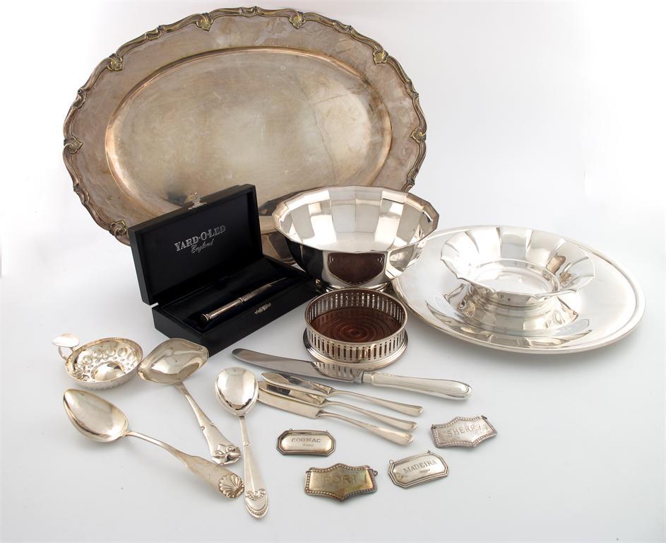 A mixed lot, comprising silver items: a Yard-o-led pencil, two wine labels, two Danish spoons, a sauce ladle, plus electroplated items: two bowls, a coaster, a meat platter and a plate. (qty)