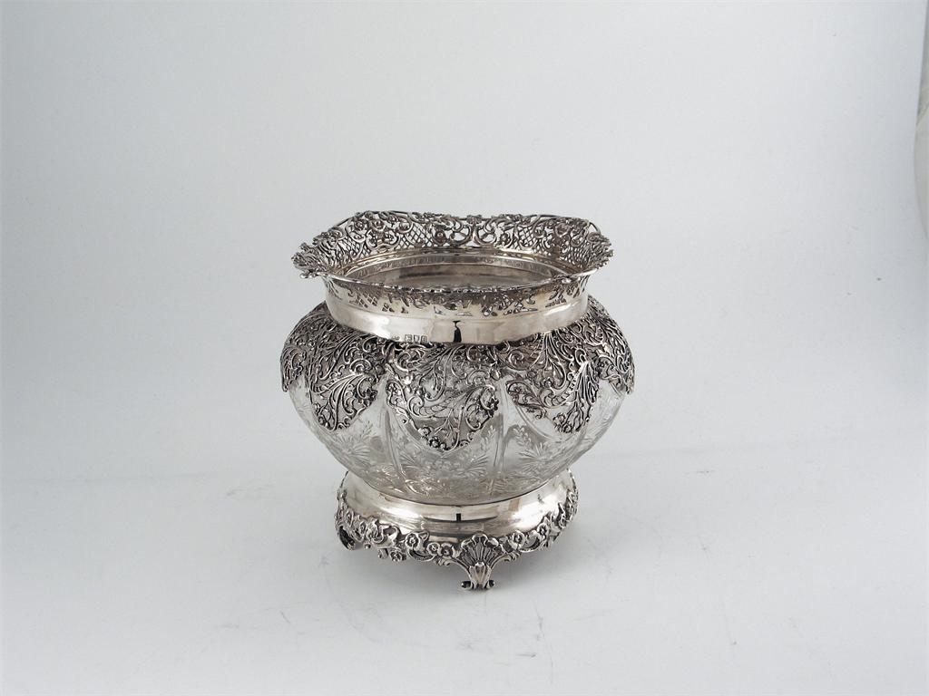 A late Victorian mounted cut glass vase, with a lobed body, a pierced mantle, and an everting rim, resting on a decorative base on four scroll feet, by William Comyns, London, 1900, 6.25in (16cm) high.